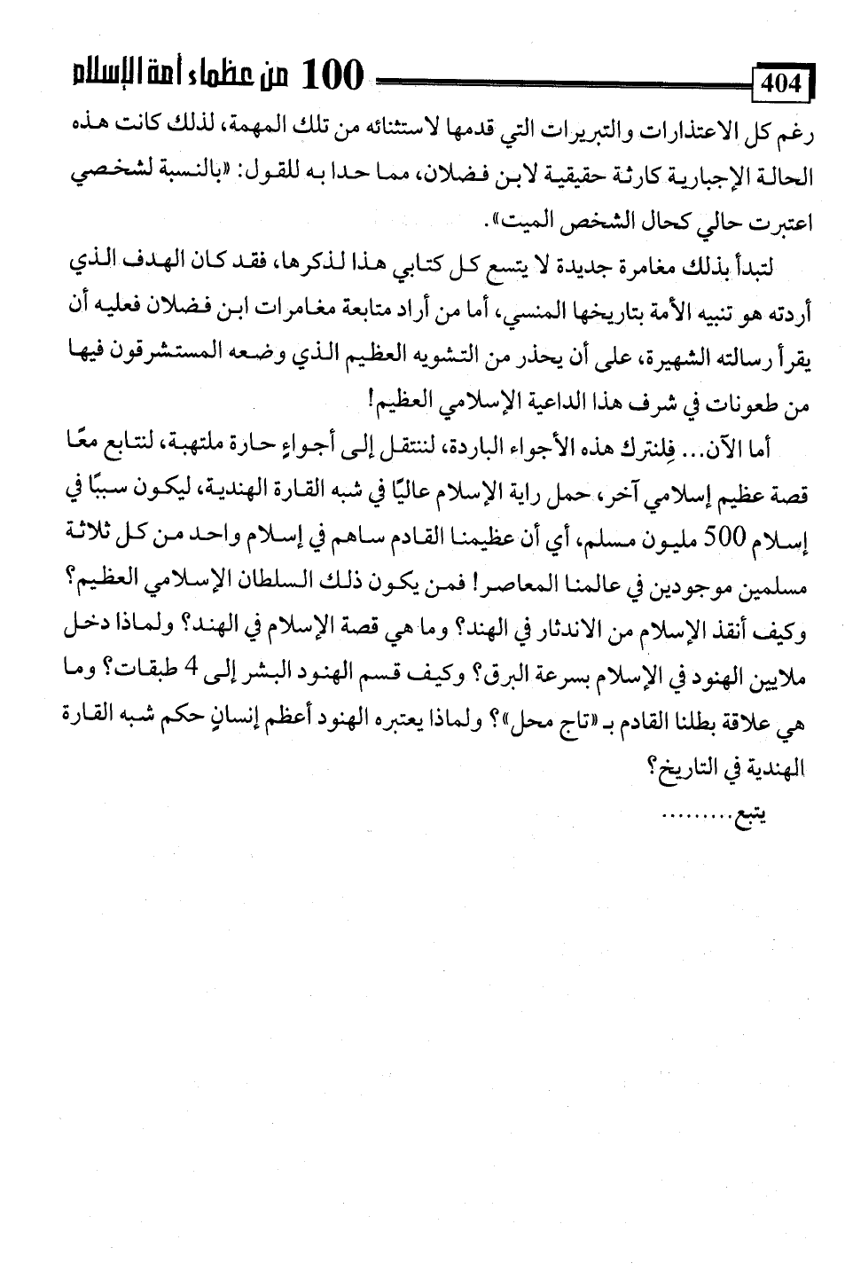 لتبدأ بذلك مغامرة جديدة لا يتسع كل كتابي هذا لذكرها، فقد كان الهدف الذي أردته هو تنبيه الأمة بتاريخها المنسي، أما من أراد متابعة مغامرات ابن فضلان فعليه أن يقرأ رسالته الشهيرة، على أن يحذر من التشويه العظيم الذي وضعه المستشرقون فيها من طعونات في شرف هذا الداعية الإسلامي العظيم!