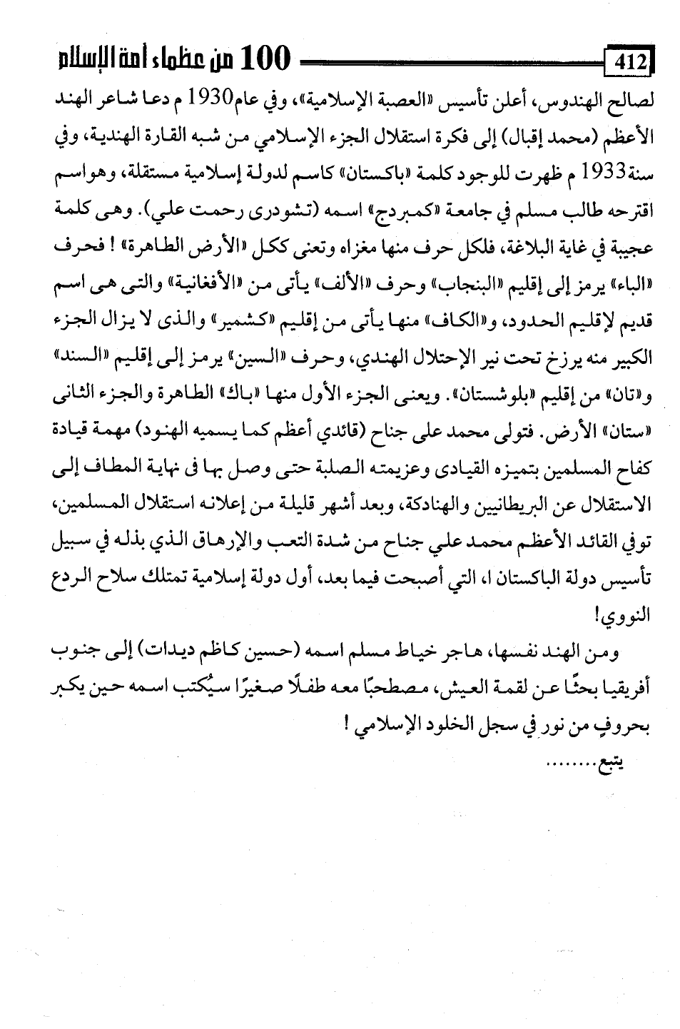 لصالح الهندوس، أعلن تأسيس "العصبة الإسلامية"، وفي عام 1930 م دعا شاعر الهند الأعظم (محمد إقبال) إلى فكرة استقلال الجزء الإسلامي من شبه القارة الهندية، وفي سنة 1933 م ظهرت للوجود كلمة "باكستان" كاسم لدولة إسلامية مستقلة، وهو اسم اقترحه طالب مسلم في جامعة "كمبردج" اسمه (تشودرى رحمت علي). وهى كلمة عجيبة في غاية البلاغة، فلكل حرف منها مغزاه وتعنى ككل "الأرض الطاهرة"! فحرف "الباء" يرمز إلى إقليم "البنجاب" وحرف "الألف" يأتى من "الأفغانية" والتى هى اسم قديم لإقليم الحدود، و"الكاف" منها يأتى من إقليم "كشمير" والذى لا يزال الجزء الكبير منه يرزخ تحت نير الإحتلال الهندي، وحرف "السين" يرمز إلى إقليم "السند" و"تان" من إقليم "بلوشستان". ويعنى الجزء الأول منها "باك" الطاهرة والجزء الثانى "ستان" الأرض. فتولى محمد على جناح (قائدي أعظم كما يسميه الهنود) مهمة قيادة كفاح المسلمين بتميزه القيادى وعزيمته الصلبة حتى وصل بها فى نهاية المطاف إلى الاستقلال عن البريطانيين والهنادكة، وبعد أشهر قليلة من إعلانه استقلال المسلمين، توفي القائد الأعظم محمد علي جناح من شدة التعب والإرهاق الذي بذله في سبيل تأسيس دولة الباكستان، التي أصبحت فيما بعد، أول دولة إسلامية تمتلك سلاح الردع النووي!