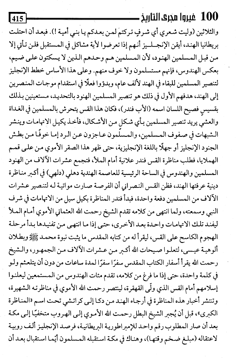 والثلاثين (وليت شعري أي شرفٍ تركتم لمن بعدكم يا بني أمية!). فبعد أن احتلت بريطانيا الهند، أيقن الإنجليز أنهم إذا تعرضوا لأية مشاكل في المستقبل فلن تأتي إلا من قبل المسلمين الهنود، لأن المسلمين هم وحدهم الذين لا يسكتون على ضيم، بعكس الهندوس، فإنهم مستسلمون ولا خوف منهم. وعلى هذا الأساس خطط الإنجليز لتنصير المسلمين للبقاء في الهند لألف عام، وبدؤوا فعلًا في استقدام موجات المنصرين إلى الهند، هدفهم الأول في ذلك هو تنصير المسلمين الهنود بالتحديد، مستعينين بذلك بقسيسٍ فصيح اللسان اسمه (الأب فندر)، فكان هذا القس يتحرش بالمسلمين في الغداة والعشي يريد تنصير المسلمين بأي شكلٍ من الأشكال، فأخذ يكيل الاتهامات وينشر الشبهات في صفوف المسلمين، والمسلمون عاجزون عن الرد إما خوفًا من بطش الجنود الإنجليز أو جهلًا باللغة الإنجليزية، حتى ظهر هذا الصقر الأموي من على قمم الهملايا، فطلب مناظرة القس فندر علانية أمام الملأ، فتجمع عشرات الآلاف من الهنود المسلمين والهندوس في الساحة الرئيسية للعاصمة الهندية دهلي (دلهي) في أكبر مناظرة دينية عرفتها الهند، فظن القس النصراني أن الفرصة صارت مواتية له لتنصير عشرات الآلاف من المسلمين دفعة واحدة، فبدأ فندر المناظرة بكيل سيل من الاتهامات في شرف النبي وسمعته، ولما انتهى من كلامه تقدم الشيخ رحمت اللَّه العثماني الأموي أمام الملأ ليفند تلك الاتهامات واحدة بعد الأخرى، حتى إذا ما انتهى من تفنيدها بدأ مرحلة الهجوم الكاسح على القس، ليقرأ له من كتابه المقدس ما يثبت نبوة محمد -صلى اللَّه عليه وسلم- وبطلان ألوهية عيسى، لتعلوا صيحات اللَّه أكبر من عشرات الآلاف من الجمهور، والشيخ رحمت اللَّه يقرأ أسفار الكتاب المقدس سفرًا سفرًا لمدة ساعات من دون أن يتلعثم ولو في كلمة واحدة، حتى إذا ما فرغ من كلامه، تقدم مئات الهندوس من المستمعين ليعلنوا إسلامهم أمام القس الذي ولّى القهقرة، لينتصر رحمت اللَّه الأموي في مناظرته الشهيرة، وتنتشر أخبار هذه المناظرة في أرجاء الهند من دكا إلى كراتشي تحت اسم "المناظرة الكبرى"، قبل أن يُجبر الشيخ البطل رحمت اللَّه الأموي إلى الهروب متخفيًا إلى مكة بعد أن صار المطلوب رقم واحد للإمبراطورية البريطانية، فرصد الإنجليز ألف روبية لاعتقاله (مبلغ ضخم وقتها)، وهناك في مكة استقبله المسلمون أيّما استقبال بعد أن