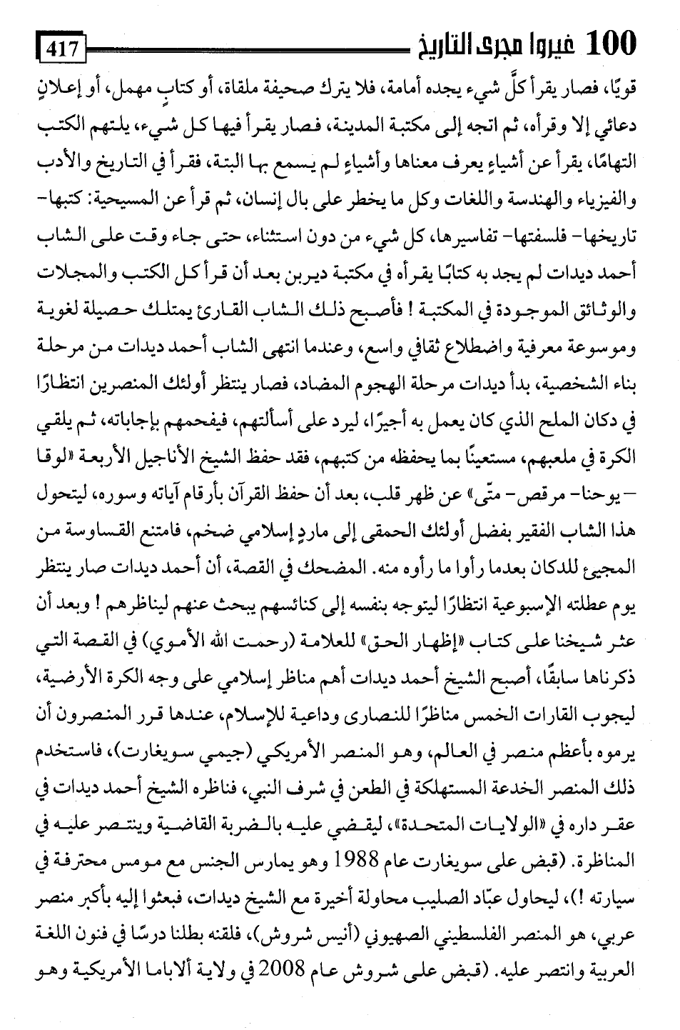 قويًا، فصار يقرأ كلَّ شيء يجده أمامة، فلا يترك صحيفة ملقاة، أو كتابٍ مهمل، أو إعلانٍ دعائي إلا وقرأه، ثم اتجه إلى مكتبة المدينة، فصار يقرأ فيها كل شيء، يلتهم الكتب التهامًا، يقرأ عن أشياءٍ يعرف معناها وأشياءٍ لم يسمع بها البتة، فقرأ في التاريخ والأدب والفيزياء والهندسة واللغات وكل ما يخطر على بال إنسان، ثم قرأ عن المسيحية: كتبها - تاريخها - فلسفتها - تفاسيرها، كل شيء من دون استثناء، حتى جاء وقت على الشاب أحمد ديدات لم يجد به كتابًا يقرأه في مكتبة ديربن بعد أن قرأ كل الكتب والمجلات والوثائق الموجودة في المكتبة! فأصبح ذلك الشاب القارئ يمتلك حصيلة لغوية وموسوعة معرفية واضطلاع ثقافي واسع، وعندما انتهى الشاب أحمد ديدات من مرحلة بناء الشخصية، بدأ ديدات مرحلة الهجوم المضاد، فصار ينتظر أولئك المنصرين انتظارًا في دكان الملح الذي كان يعمل به أجيرًا، ليرد على أسألتهم، فيفحمهم بإجاباته، ثم يلقي الكرة في ملعبهم، مستعينًا بما يحفظه من كتبهم، فقد حفظ الشيخ الأناجيل الأربعة "لوقا - يوحنا - مرقص - متّى" عن ظهر قلب، بعد أن حفظ القرآن بأرقام آياته وسوره، ليتحول هذا الشاب الفقير بفضل أولئك الحمقى إلى ماردٍ إسلامي ضخم، فامتنع القساوسة من المجيئ للدكان بعدما رأوا ما رأوه منه. المضحك في القصة، أن أحمد ديدات صار ينتظر يوم عطلته الإسبوعية انتظارًا ليتوجه بنفسه إلى كنائسهم يبحث عنهم ليناظرهم! وبعد أن عثر شيخنا على كتاب "إظهار الحق" للعلامة (رحمت اللَّه الأموي) في القصة التي ذكرناها سابقًا، أصبح الشيخ أحمد ديدات أهم مناظر إسلامي على وجه الكرة الأرضية، ليجوب القارات الخمس مناظرًا للنصارى وداعية للإسلام، عندها قرر المنصرون أن يرموه بأعظم منصر في العالم، وهو المنصر الأمريكي (جيمي سويغارت)، فاستخدم ذلك المنصر الخدعة المستهلكة في الطعن في شرف النبي، فناظره الشيخ أحمد ديدات في عقر داره في "الولايات المتحدة"، ليقضي عليه بالضربة القاضية وينتصر عليه في المناظرة. (قبض على سويغارت عام 1988 وهو يمارس الجنس مع مومس محترفة في سيارته!)، ليحاول عبّاد الصليب محاولة أخيرة مع الشيخ ديدات، فبعثوا إليه بأكبر منصر عربي، هو المنصر الفلسطيني الصهيوني (أنيس شروش)، فلقنه بطلنا درسًا في فنون اللغة العربية وانتصر عليه. (قبض على شروش عام 2008 في ولاية ألاباما الأمريكية وهو