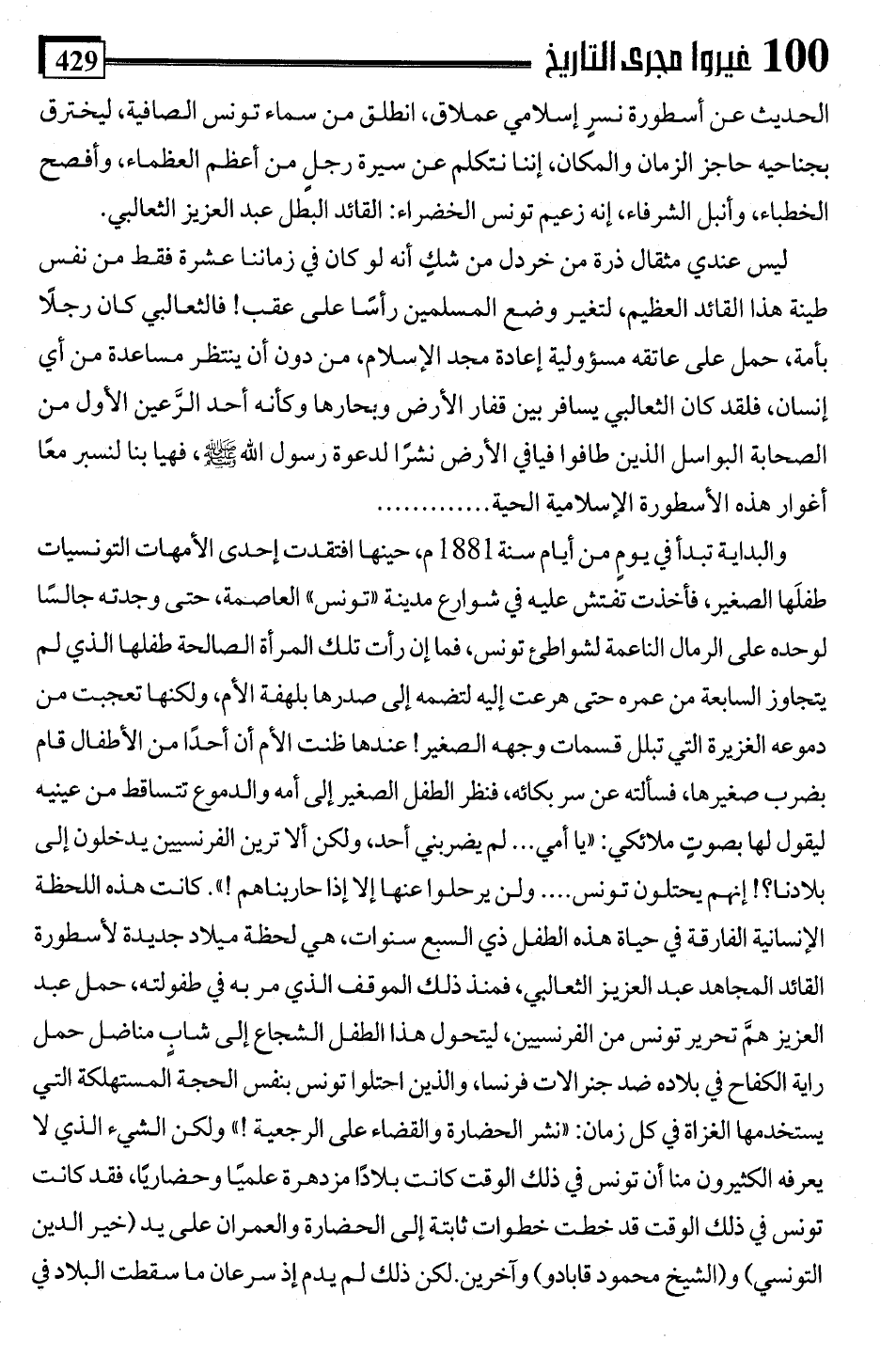 الحديث عن أسطورة نسرٍ إسلامي عملاق، انطلق من سماء تونس الصافية، ليخترق بجناحيه حاجز الزمان والمكان، إننا نتكلم عن سيرة رجلٍ من أعظم العظماء، وأفصح الخطباء، وأنبل الشرفاء، إنه زعيم تونس الخضراء: القائد البطل عبد العزيز الثعالبي.