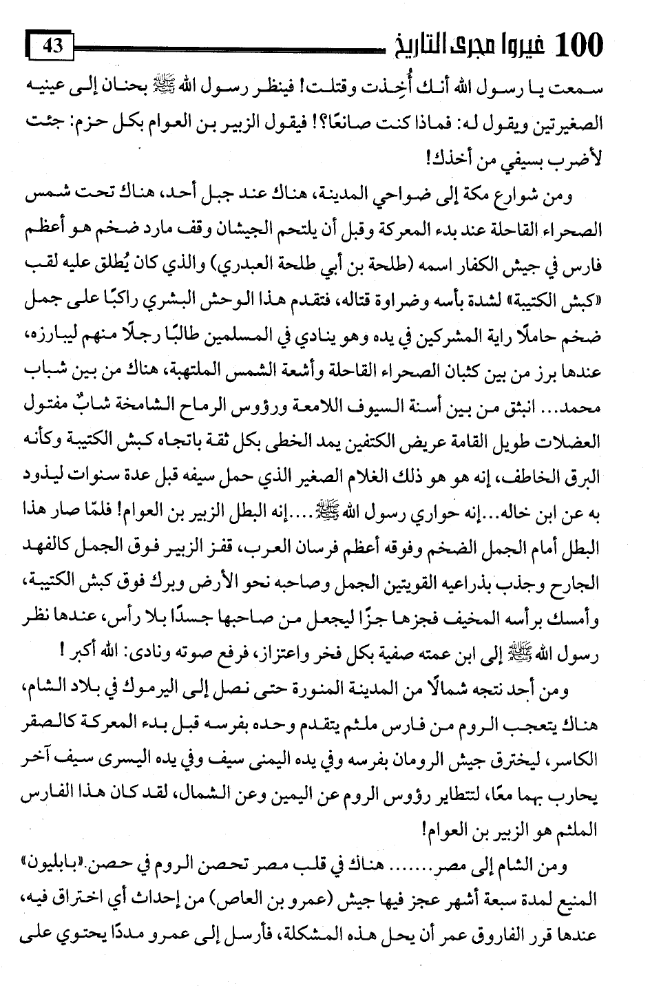 ومن شوارع مكة إلى ضواحي المدينة، هناك عند جبل أحد، هناك تحت شمس الصحراء القاحلة عند بدء المعركة وقبل أن يلتحم الجيشان وقف ما رد ضخم هو أعظم فارس في جيش الكفار اسمه (طلحة بن أبي طلحة العبدري) والذي كان يُطلق عليه لقب "كبش الكتيبة" لشدة بأسه وضراوة قتاله، فتقدم هذا الوحش البشري راكبًا على جمل ضخم حاملًا راية المشركين في يده وهو ينادي في المسلمين طالبًا رجلًا منهم ليبارزه، عندها برز من بين كثبان الصحراء القاحلة وأشعة الشمس الملتهبة، هناك من بين شباب محمد. . . انبثق من بين أسنة السيوف اللامعة ورؤوس الرماح الشامخة شابٌ مفتول العضلات طويل القامة عريض الكتفين يمد الخطى بكل ثقة باتجاه كبش الكتيبة وكأنه البرق الخاطف، إنه هو هو ذلك الغلام الصغير الذي حمل سيفه قبل عدة سنوات ليذود به عن ابن خاله. . . إنه حواري رسول اللَّه -صلى اللَّه عليه وسلم-. . . . إنه البطل الزبير بن العوام! فلمّا صار هذا البطل أمام الجمل الضخم وفوقه أعظم فرسان العرب، قفز الزبير فوق الجمل كالفهد الجارح وجذب بذراعيه القويتين الجمل وصاحبه نحو الأرض وبرك فوق كبش الكتيبة، وأمسك برأسه المخيف فجزها جزًا ليجعل من صاحبها جسدًا بلا رأس، عندها نظر رسول اللَّه -صلى اللَّه عليه وسلم- إلى ابن عمته صفية بكل فخر واعتزاز، فرفع صوته ونادى: اللَّه أكبر!