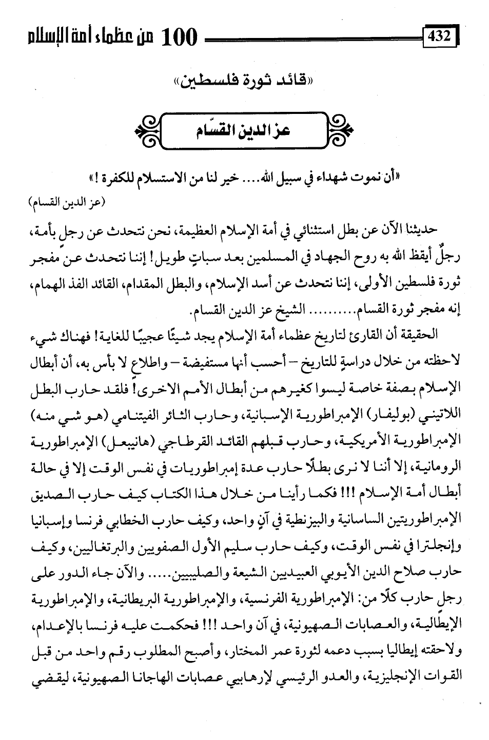 حديثنا الآن عن بطل استثنائي في أمة الإسلام العظيمة، نحن نتحدث عن رجلٍ بأمة، رجلٌ أيقظ اللَّه به روح الجهاد في المسلمين بعد سباتٍ طويل! إننا نتحدث عن مفجر ثورة فلسطين الأولى، إننا نتحدث عن أسد الإسلام، والبطل المقدام، القائد الفذ الهمام، إنه مفجر ثورة القسام. . . . . الشيخ عز الدين القسام.