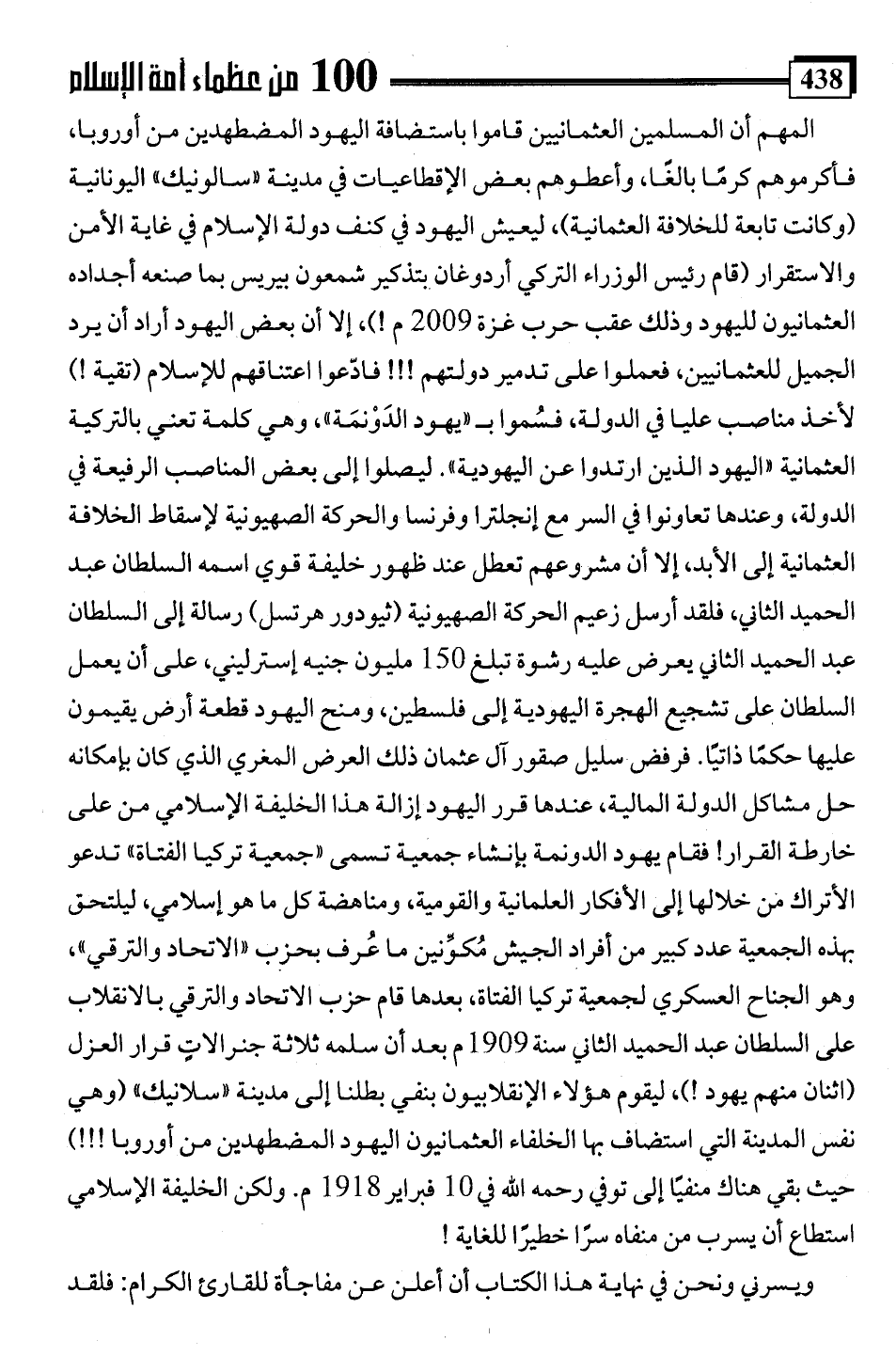 المهم أن المسلمين العثمانيين قاموا باستضافة اليهود المضطهدين من أوروبا، فأكرموهم كرمًا بالغًا، وأعطوهم بعض الإقطاعيات في مدينة "سالونيك" اليونانية (وكانت تابعة للخلافة العثمانية)، ليعيش اليهود في كنف دولة الإسلام في غاية الأمن والاستقرار (قام رئيس الوزراء التركي أردوغان بتذكير شمعون بيريس بما صنعه أجداده العثمانيون لليهود وذلك عقب حرب غزة 2009 م!)، إلا أن بعض اليهود أراد أن يرد الجميل للعثمانيين، فعملوا على تدمير دولتهم!!! فادّعوا اعتناقهم للإسلام (تقية!) لأخذ مناصب عليا في الدولة، فسُموا بـ "يهود الدَوْنمَة"، وهي كلمة تعني بالتركية العثمانية "اليهود الذين ارتدوا عن اليهودية". ليصلوا إلى بعض المناصب الرفيعة في الدولة، وعندها تعاونوا في السر مع إنجلترا وفرنسا والحركة الصهيونية لإسقاط الخلافة العثمانية إلى الأبد، إلا أن مشروعهم تعطل عند ظهور خليفة قوي اسمه السلطان عبد الحميد الثاني، فلقد أرسل زعيم الحركة الصهيونية (ثيودور هرتسل) رسالة إلى السلطان عبد الحميد الثاني يعرض عليه رشوة تبلغ 150 مليون جنيه إسترليني، على أن يعمل السلطان على تشجيع الهجرة اليهودية إلى فلسطين، ومنح اليهود قطعة أرض يقيمون عليها حكمًا ذاتيًا. فرفض سليل صقور آل عثمان ذلك العرض المغري الذي كان بإمكانه حل مشاكل الدولة المالية، عندها قرر اليهود إزالة هذا الخليفة الإسلامي من على خارطة القرار! فقام يهود الدونمة بإنشاء جمعية تسمى "جمعية تركيا الفتاة" تدعو الأتراك من خلالها إلى الأفكار العلمانية والقومية، ومناهضة كل ما هو إسلامي، ليلتحق بهذه الجمعية عدد كبير من أفراد الجيش مُكوِّنين ما عُرف بحزب "الاتحاد والترقي"، وهو الجناح العسكري لجمعية تركيا الفتاة، بعدها قام حزب الاتحاد والترقي بالانقلاب على السلطان عبد الحميد الثاني سنة 1909 م بعد أن سلمه ثلاثة جنرالاتٍ قرار العزل (اثنان منهم يهود!)، ليقوم هؤلاء الإنقلابيون بنفي بطلنا إلى مدينة "سلانيك" (وهي نفس المدينة التي استضاف بها الخلفاء العثمانيون اليهود المضطهدين من أوروبا!!!) حيث بقي هناك منفيًا إلى توفي رحمه اللَّه في 10 فبراير 1918 م. ولكن الخليفة الإسلامي استطاع أن يسرب من منفاه سرًا خطيرًا للغاية!
