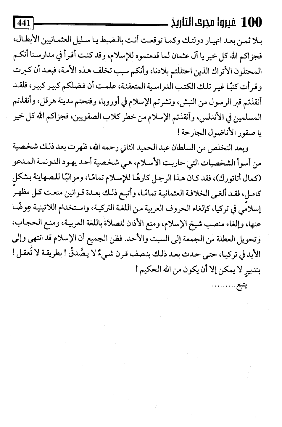 بلا ثمن بعد انهيار دولتك وكما توقعت أنت بالضبط يا سليل العثمانيين الأبطال، فجزاكم اللَّه كل خير يا آل عثمان لما قدمتموه للإسلام، وقد كنت أقرأ في مدارسنا أنكم المحتلون الأتراك الذين احتللتم بلادنا، وأنكم سبب تخلف هذه الأمة، فبعد أن كبرت وقرأت كتبًا غير تلك الكتب الدراسية المتعفنة، علمت أن فضلكم كبير كبير، فلقد أنقذتم قبر الرسول من النبش، ونشرتم الإسلام في أوروبا، وفتحتم مدينة هرقل، وأنقذتم المسلمين في الأندلس، وأنقذتم الإسلام من خطر كلاب الصفويين، فجزاكم اللَّه كل خير يا صقور الأناضول الجارحة!