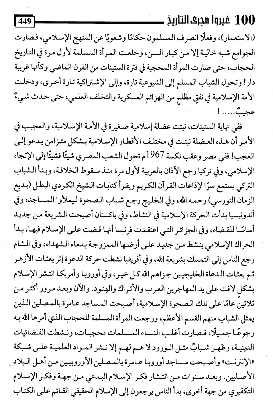 (الاستعمار)، وفعلًا انصرف المسلمون حكامًا وشعوبًا عن المنهج الإسلامي، فصارت الجوامع شبه خالية إلا من كبار السن، وخلعت المرأة المسلمة لأول مرة في التاريخ الحجاب، حتى صارت المرأة المحجبة في فترة الستينات من القرن الماضي وكأنها غريبة دار! وتحول الشباب المسلم إلى الشيوعية تارة، وإلى الإشتراكية تارة أخرى، ودخلت الأمة الإسلامية في نفقٍ مظلمٍ من الهزائم العسكرية والتخلف العلمي، حتى حدث شيءٌ عجيببٌ. . . .!