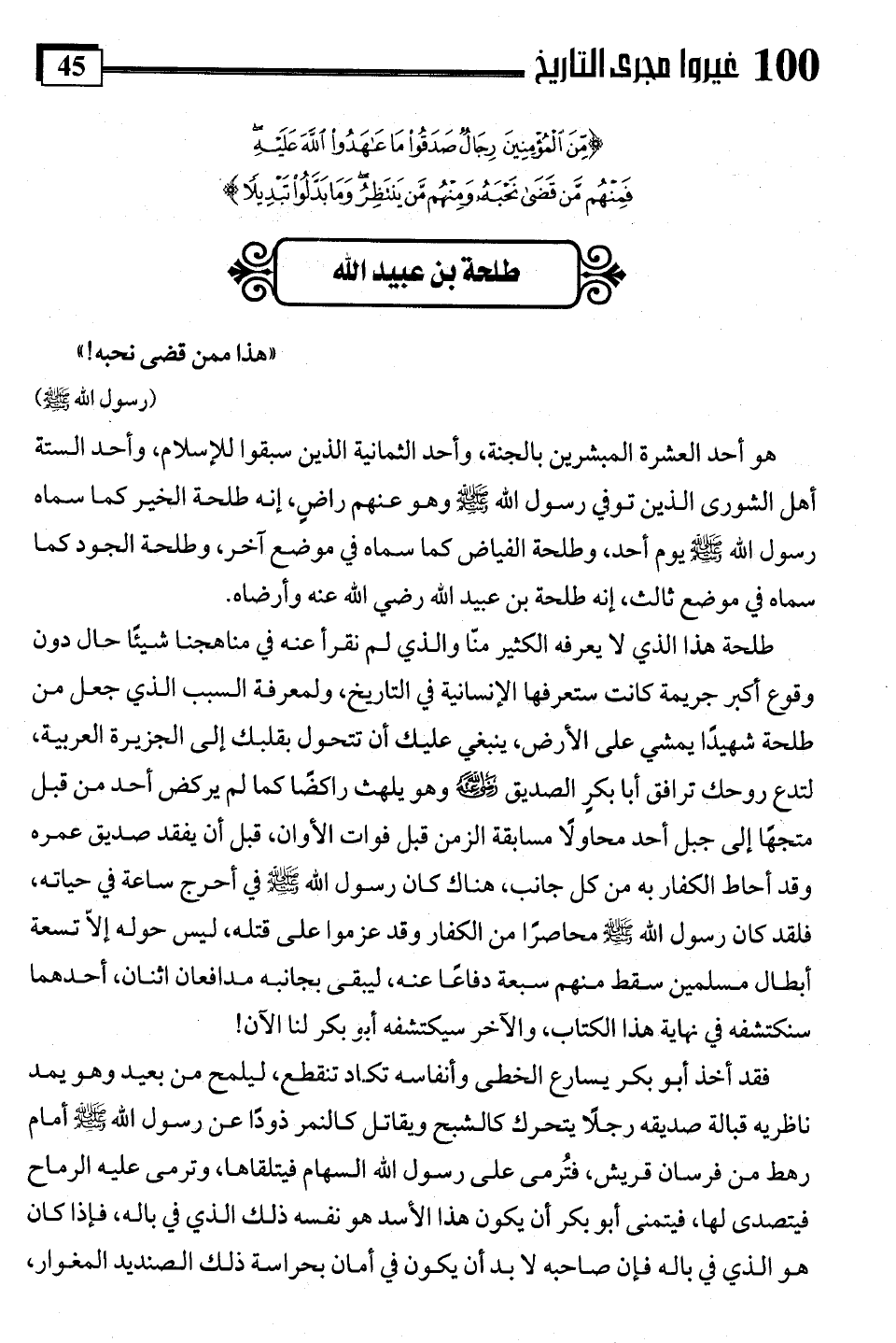طلحة هذا الذي لا يعرفه الكثير منّا والذي لم نقرأ عنه في مناهجنا شيئًا حال دون وقوع أكبر جريمة كانت ستعرفها الإنسانية في التاريخ، ولمعرفة السبب الذي جعل من طلحة شهيدًا يمشي على الأرض، ينبغي عليك أن تتحول بقلبك إلى الجزيرة العربية، لتدع روحك ترافق أبا بكرٍ الصديق -رضي اللَّه عنه- وهو يلهث راكضًا كما لم يركض أحد من قبل متجهًا إلى جبل أحد محاولًا مسابقة الزمن قبل فوات الأوان، قبل أن يفقد صديق عمره وقد أحاط الكفار به من كل جانب، هناك كان رسول اللَّه -صلى اللَّه عليه وسلم- في أحرج ساعة في حياته، فلقد كان رسول اللَّه -صلى اللَّه عليه وسلم- محاصرًا من الكفار وقد عزموا على قتله، ليس حوله إلّا تسعة أبطال مسلمين سقط منهم سبعة دفاعًا عنه، ليبقى بجانبه مدافعان اثنان، أحدهما سنكتشفه في نهاية هذا الكتاب، والآخر سيكتشفه أبو بكر لنا الآن!