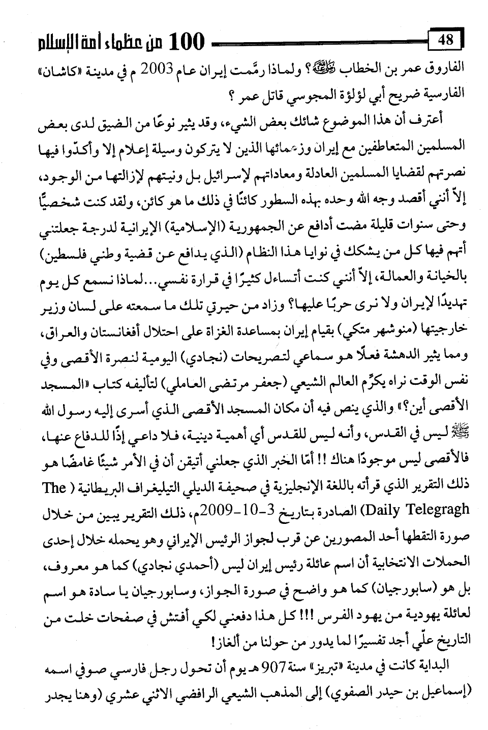 أعترف أن هذا الموضوع شائك بعض الشيء، وقد يثير نوعًا من الضيق لدي بعض المسلمين المتعاطفين مع إيران وزعمائها الذين لا يتركون وسيلة إعلام إلا وأكدّوا فيها نصرتهم لقضايا المسلمين العادلة ومعاداتهم لإسرائيل بل ونيتهم لإزالتها من الوجود، إلّا أنني أقصد وجه اللَّه وحده بهذه السطور كائنًا في ذلك ما هو كائن، ولقد كنت شخصيًّا وحتى سنوات قليلة مضت أدافع عن الجمهورية (الإسلامية) الإيرانية لدرجة جعلتني أتهم فيها كل من يشكك في نوايا هذا النظام (الذي يدافع عن قضية وطني فلسطين) بالخيانة والعمالة، إلّا أنني كنت أتساءل كثيرًا في قرارة نفسي. . . لماذا نسمع كل يوم تهديدًا لإيران ولا نرى حربًا عليها؟ وزاد من حيرتي تلك ما سمعته على لسان وزير خارجيتها (منوشهر متكي) بقيام إيران بمساعدة الغزاة على احتلال أفغانستان والعراق، ومما يثير الدهشة فعلًا هو سماعي لتصريحات (نجادي) اليومية لنصرة الأقصى وفي نفس الوقت نراه يكرِّم العالم الشيعي (جعفر مرتضى العاملي) لتأليفه كتاب "المسجد الأقصى أين؟ " والذي ينص فيه أن مكان المسجد الأقصى الذي أسرى إليه رسول اللَّه -صلى اللَّه عليه وسلم- ليس في القدس، وأنه ليس للقدس أي أهمية دينية، فلا داعي إذًا للدفاع عنها، فالأقصى ليس موجودًا هناك!! أمّا الخبر الذي جعلني أتيقن أن في الأمر شيئًا غامضًا هو ذلك التقرير الذي قرأته باللغة الإنجليزية في صحيفة الديلي التيليغراف البريطانية (The Daily Telegragh) الصادرة بتاريخ 3 - 10 - 2009 م، ذلك التقرير يبين من خلال صورة التقطها أحد المصورين عن قرب لجواز الرئيس الإيراني وهو يحمله خلال إحدى الحملات الانتخابية أن اسم عائلة رئيس إيران ليس (أحمدي نجادي) كما هو معروف، بل هو (سابورجيان) كما هو واضح في صورة الجواز، وسابورجيان يا سادة هو اسم لعائلة يهودية من يهود الفرس!!! كل هذا دفعني لكي أفتش في صفحات خلت من التاريخ علّي أجد تفسيرًا لما يدور من حولنا من ألغاز!