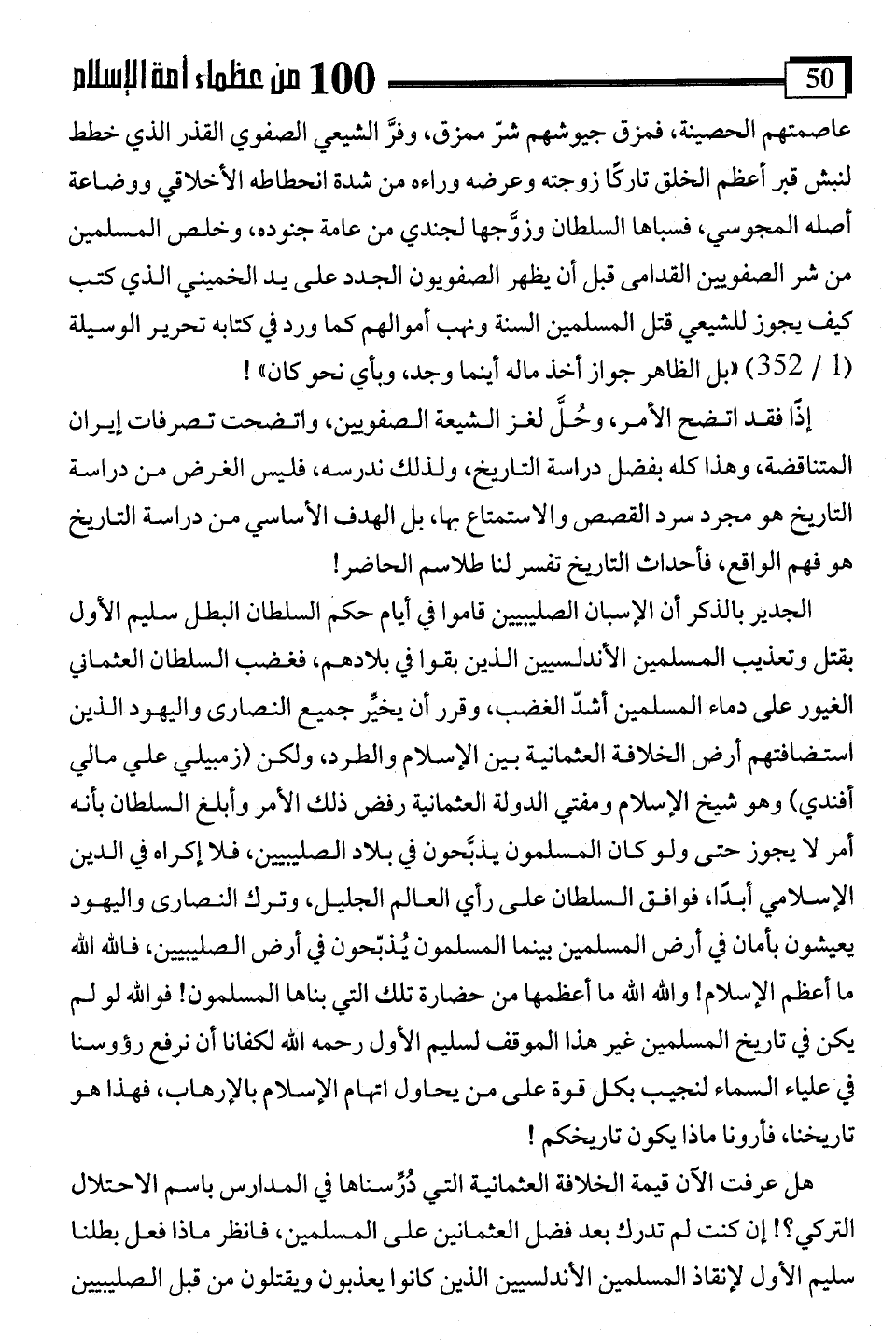 عاصمتهم الحصينة، فمزق جيوشهم شرّ ممزق، وفرَّ الشيعي الصفوي القذر الذي خطط لنبش قبر أعظم الخلق تاركًا زوجته وعرضه وراءه من شدة انحطاطه الأخلاقي ووضاعة أصله المجوسي، فسباها السلطان وزوَّجها لجندي من عامة جنوده، وخلص المسلمين من شر الصفويين القدامى قبل أن يظهر الصفويون الجدد على يد الخميني الذي كتب كيف يجوز للشيعي قتل المسلمين السنة ونهب أموالهم كما ورد في كتابه تحرير الوسيلة (1/ 352) "بل الظاهر جواز أخذ ماله أينما وجد، وبأي نحو كان"!