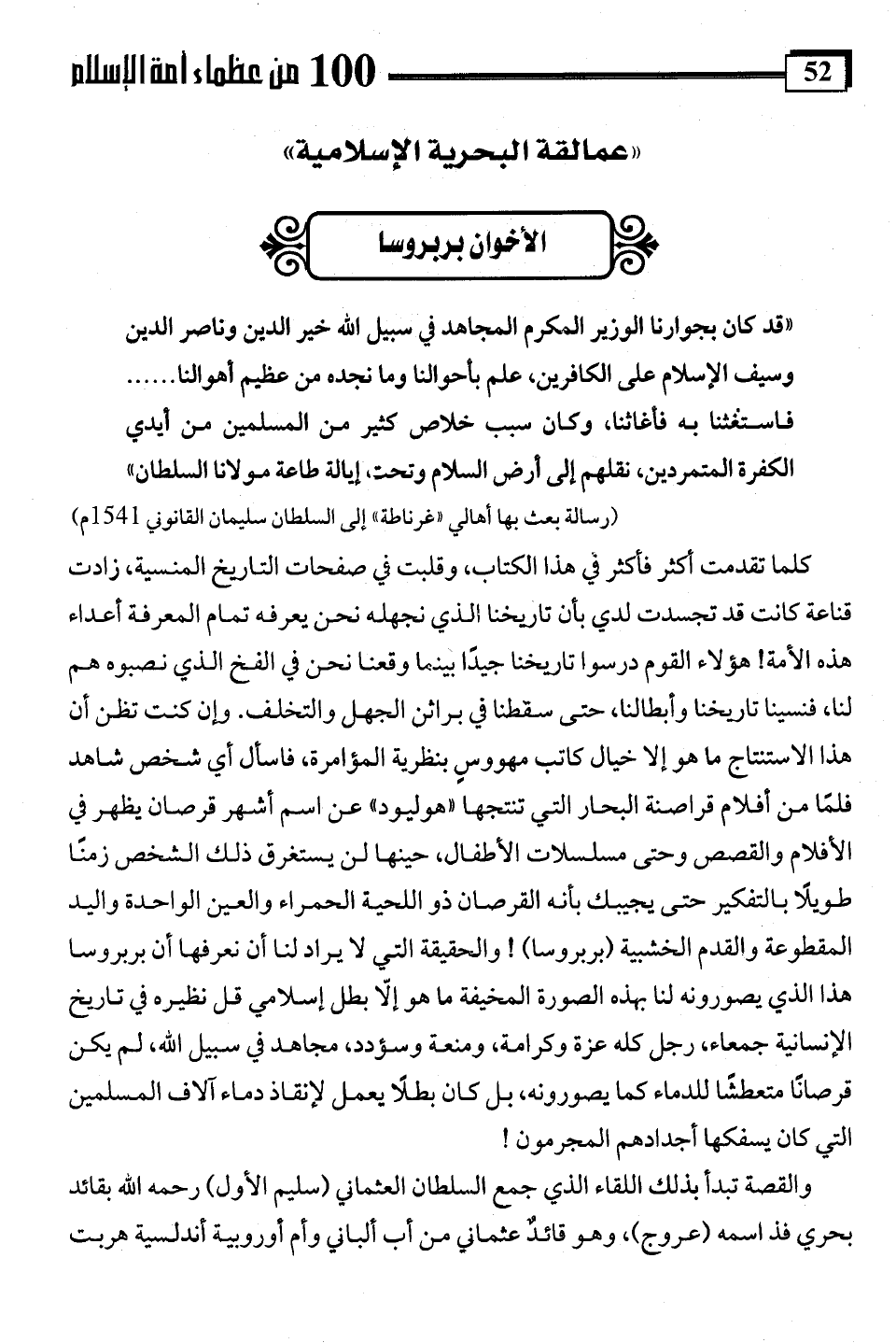 كلما تقدمت "أكثر فأكثر في هذا الكتاب، وقلبت في صفحات التاريخ المنسية، زادت قناعة كانت قد تجسدت لدي بأن تاريخنا الذي نجهله نحن يعرفه تمام المعرفة أعداء هذه الأمة! هؤلاء القوم درسوا تاريخنا جيدًا بينما وقعنا نحن في الفخ الذي نصبوه هم لنا، فنسينا تاريخنا وأبطالنا، حتى سقطنا في براثن الجهل والتخلف. وإن كنت تظن أن هذا الاستنتاج ما هو إلا خيال كاتب مهووسٍ بنظرية المؤامرة، فاسأل أي شخص شاهد فلمًا من أفلام قراصنة البحار التي تنتجها "هوليود" عن اسم أشهر قرصان يظهر في الأفلام والقصص وحتى مسلسلات الأطفال، حينها لن يستغرق ذلك الشخص زمنًا طويلاً بالتفكير حتى يجيبك بأنه القرصان ذو اللحية الحمراء والعين الواحدة واليد المقطوعة والقدم الخشبية (بربروسا)! والحقيقة التي لا يراد لنا أن نعرفها أن بربروسا هذا الذي يصورونه لنا بهذه الصورة المخيفة ما هو إلّا بطل إسلامي قل نظيره في تاريخ الإنسانية جمعاء، رجل كله عزة وكرامة، ومنعة وسؤدد، مجاهد في سبيل اللَّه، لم يكن قرصانًا متعطشًا للدماء كما يصورونه، بل كان بطلاً يعمل لإنقاذ دماء آلاف المسلمين التي كان يسفكها أجدادهم المجرمون!