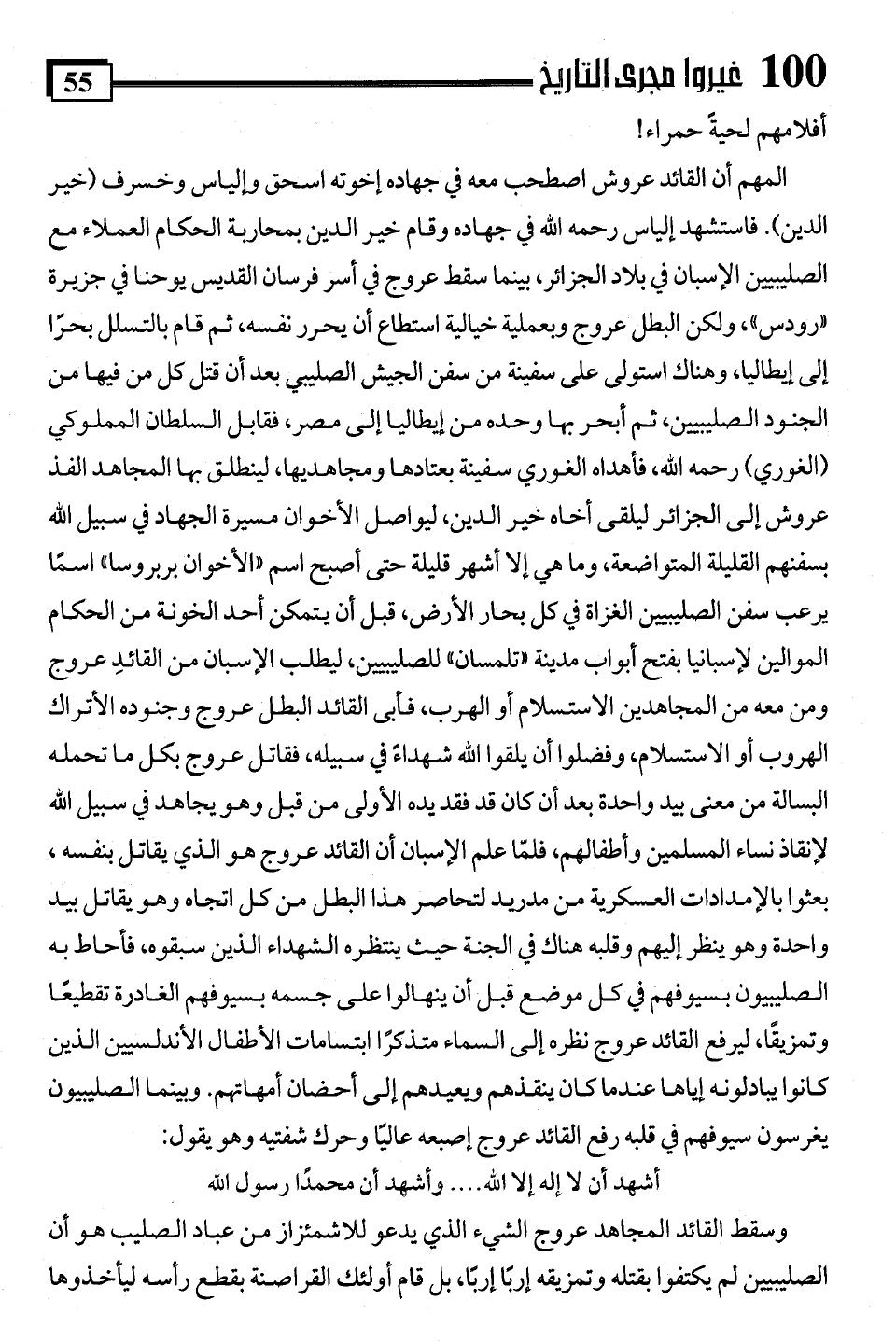 المهم أن القائد عروش اصطحب معه في جهاده إخوته اسحق وإلياس وخسرف (خير الدين). فاستشهد إلياس رحمه اللَّه في جهاده وقام خير الدين بمحاربة الحكام العملاء مع الصليبيين الإسبان في بلاد الجزائر، بينما سقط عروج في أسر فرسان القديس يوحنا في جزيرة "رودس"، ولكن البطل عروج وبعملية خيالية استطاع أن يحرر نفسه، ثم قام بالتسلل بحرًا إلى إيطاليا، وهناك استولى على سفينة من سفن الجيش الصليبي بعد أن قتل كل من فيها من الجنود الصليبيين، ثم أبحر بها وحده من إيطاليا إلى مصر، فقابل السلطان المملوكي (الغوري) رحمه اللَّه، فأهداه الغوري سفينة بعتادها ومجاهديها، لينطلق بها المجاهد الفذ عروش إلى الجزائر ليلقى أخاه خير الدين، ليواصل الأخوان مسيرة الجهاد في سبيل اللَّه بسفنهم القليلة المتواضعة، وما هي إلا أشهر قليلة حتى أصبح اسم "الأخوان بربروسا" اسمًا يرعب سفن الصليبيين الغزاة في كل بحار الأرض، قبل أن يتمكن أحد الخونة من الحكام الموالين لإسبانيا بفتح أبواب مدينة "تلمسان" للصليبيين، ليطلب الإسبان من القائدِ عروج ومن معه من المجاهدين الاستسلام أو الهرب، فأبى القائد البطل عروج وجنوده الأتراك الهروب أو الاستسلام، وفضلوا أن يلقوا اللَّه شهداءً في سبيله، فقاتل عروج بكل ما تحمله البسالة من معنى بيد واحدة بعد أن كان قد فقد يده الأولى من قبل وهو يجاهد في سبيل اللَّه لإنقاذ نساء المسلمين وأطفالهم، فلمّا علم الإسبان أن القائد عروج هو الذي يقاتل بنفسه، بعثوا بالإمدادات العسكرية من مدريد لتحاصر هذا البطل من كل اتجاه وهو يقاتل بيد واحدة وهو ينظر إليهم وقلبه هناك في الجنة حيث ينتظره الشهداء الذين سبقوه، فأحاط به الصليبيون بسيوفهم في كل موضع قبل أن ينهالوا على جسمه بسيوفهم الغادرة تقطيعًا وتمزيقًا، ليرفع القائد عروج نظره إلى السماء متذكرًا ابتسامات الأطفال الأندلسيين الذين كانوا يبادلونه إياها عندما كان ينقذهم ويعيدهم إلى أحضان أمهاتهم. وبينما الصليبيون يغرسون سيوفهم في قلبه رفع القائد عروج إصبعه عاليًا وحرك شفتيه وهو يقول:
