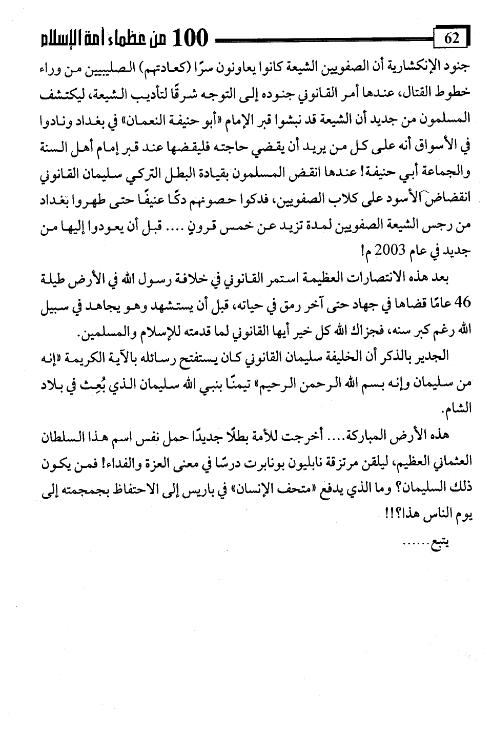 جنود الإنكشارية أن الصفويين الشيعة كانوا يعاونون سرًا (كعادتهم) الصليبيين من وراء خطوط القتال، عندها أمر القانوني جنوده إلى التوجه شرقًا لتأديب الشيعة، ليكتشف المسلمون من جديد أن الشيعة قد نبشوا قبر الإمام "أبو حنيفة النعمان" في بغداد ونادوا في الأسواق أنه على كل من يريد أن يقضي حاجته فليقضها عند قبر إمام أهل السنة والجماعة أبي حنيفة! عندها انقض المسلمون بقيادة البطل التركي سليمان القانوني انقضاض الأسود على كلاب الصفويين، فدكوا حصونهم دكًا عنيفًا حتى طهروا بَغداد من رجس الشيعة الصفويين لمدة تزيد عن خمس قرونٍ. . . . قبل أن يعودوا إليها من جديد في عام 2003 م!