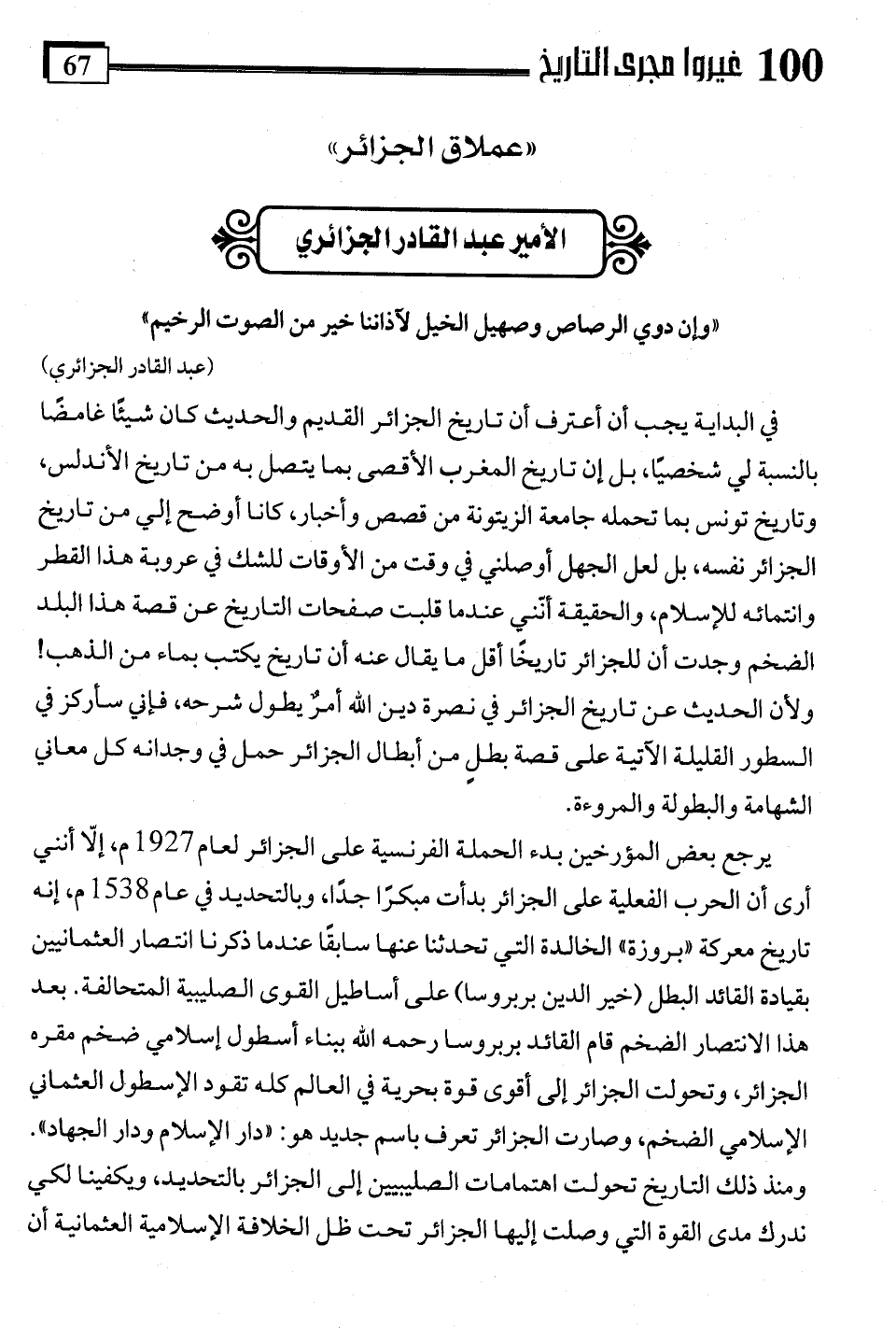 في البداية يجب أن أعترف أن تاريخ الجزائر القديم والحديث كان شيئًا غامضًا بالنسبة لي شخصيًا، بل إن تاريخ المغرب الأقصى بما يتصل به من تاريخ الأندلس، وتاريخ تونس بما تحمله جامعة الزيتونة من قصص وأخبار، كانا أوضح إلي من تاريخ الجزائر نفسه، بل لعل الجهل أوصلني في وقت من الأوقات للشك في عروبة هذا القطر وانتمائه للإسلام، والحقيقة أنّني عندما قلبت صفحات التاريخ عن قصة هذا البلد الضخم وجدت أن للجزائر تاريخًا أقل ما يقال عنه أن تاريخ يكتب بماء من الذهب! ولأن الحديث عن تاريخ الجزائر في نصرة دين اللَّه أمرٌ يطول شرحه، فإني سأركز في السطور القليلة الآتية على قصة بطلٍ من أبطال الجزائر حمل في وجدانه كل معاني الشهامة والبطولة والمروءة.