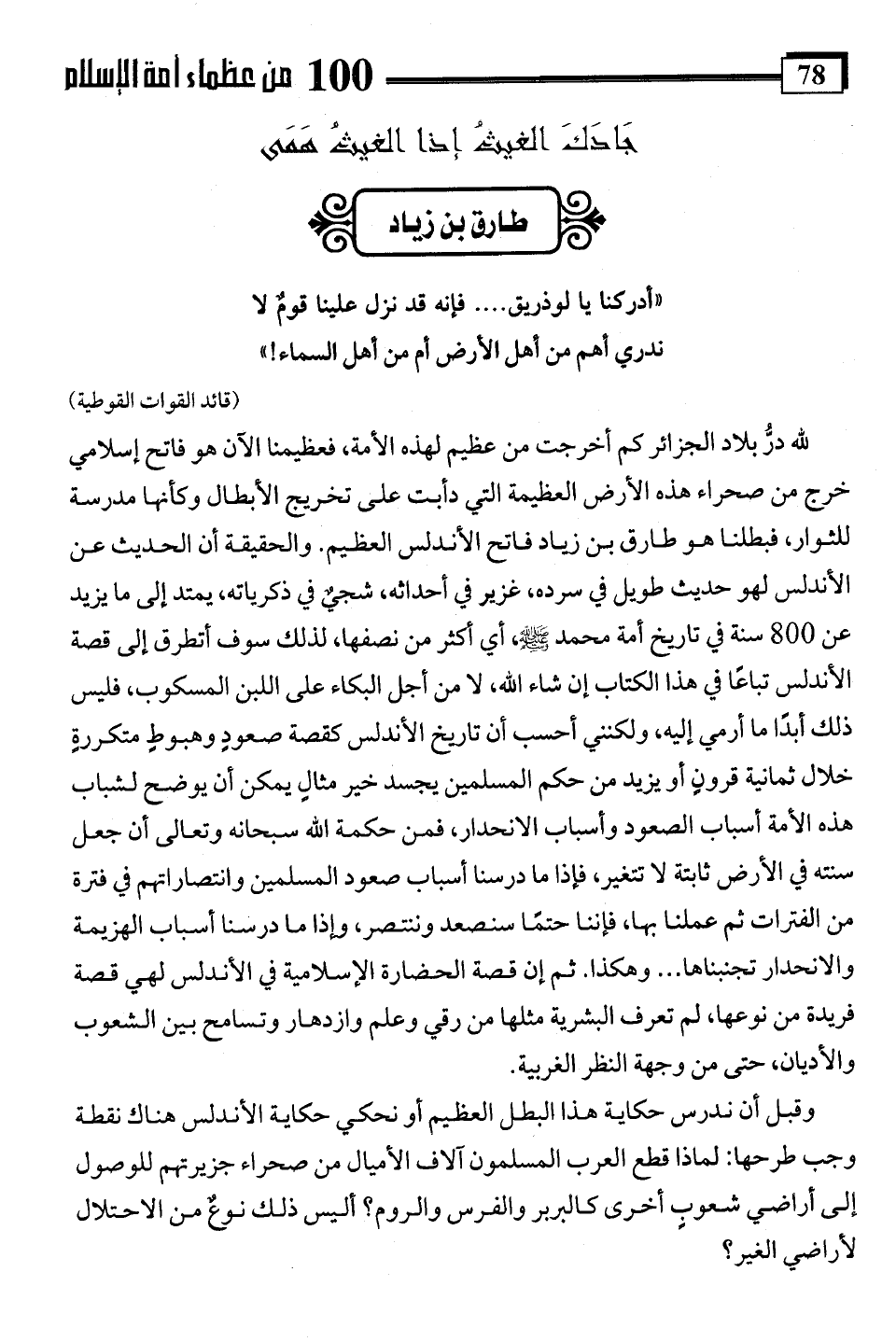 للَّه درُّ بلاد الجزائر كم أخرجت من عظيم لهذه الأمة، فعظيمنا الآن هو فاتح إسلامي خرج من صحراء هذه الأرض العظيمة التي دأبت على تخريج الأبطال وكأنها مدرسة للثوار، فبطلنا هو طارق بن زياد فاتح الأندلس العظيم. والحقيقة أن الحديث عن الأندلس لهو حديث طويل في سرده، غزير في أحداثه، شجيٌ في ذكرياته، يمتد إلى ما يزيد عن 800 سنة في تاريخ أمة محمد -صلى اللَّه عليه وسلم-، أي أكثر من نصفها، لذلك سوف أتطرق إلى قصة الأندلس تباعًا في هذا الكتاب إن شاء اللَّه، لا من أجل البكاء على اللبن المسكوب، فليس ذلك أبدًا ما أرمي إليه، ولكنني أحسب أن تاريخ الأندلس كقصة صعودٍ وهبوطٍ متكررةٍ خلال ثمانية قرونٍ أو يزيد من حكم المسلمين يجسد خير مثالٍ يمكن أن يوضح لشباب هذه الأمة أسباب الصعود وأسباب الانحدار، فمن حكمة اللَّه سبحانه وتعالى أن جعل سنته في الأرض ثابتة لا تتغير، فإذا ما درسنا أسباب صعود المسلمين وانتصاراتهم في فترة من الفترات ثم عملنا بها، فإننا حتمًا سنصعد وننتصر، وإذا ما درسنا أسباب الهزيمة والانحدار تجنبناها. . . وهكذا. ثم إن قصة الحضارة الإسلامية في الأندلس لهي قصة فريدة من نوعها، لم تعرف البشرية مثلها من رقي وعلم وازدهار وتسامح بين الشعوب والأديان، حتى من وجهة النظر الغربية.
