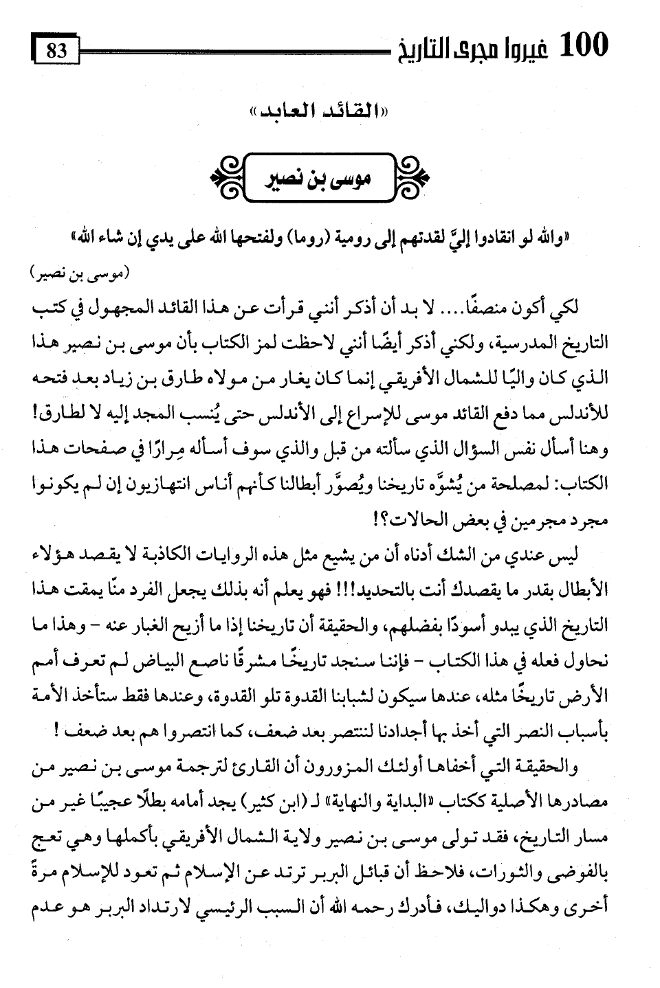 لكي أكون منصفًا. . . . لا بد أن أذكر أنني قرأت عن هذا القائد المجهول في كتب التاريخ المدرسية، ولكني أذكر أيضًا أنني لاحظت لمز الكتاب بأن موسى بن نصير هذا الذي كان واليًا للشمال الأفريقي إنما كان يغار من مولاه طارق بن زياد بعد فتحه للأندلس مما دفع القائد موسى للإسراع إلى الأندلس حتى يُنسب المجد إليه لا لطارق! وهنا أسأل نفس السؤال الذي سألته من قبل والذي سوف أسأله مِرارًا في صفحات هذا الكتاب: لمصلحة من يُشوَّه تاريخنا ويُصوَّر أبطالنا كأنهم أناس انتهازيون إن لم يكونوا مجرد مجرمين في بعض الحالات؟!