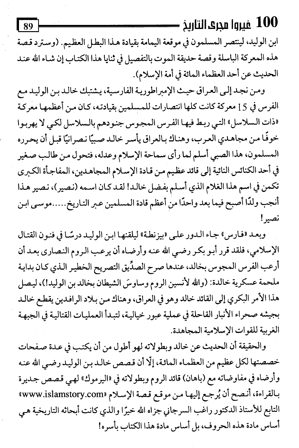 والحقيقة أن الحديث عن خالد وبطولاته لهو أطول من أن يكتب في عدة صفحات خصصتها لكل عظيم من العظماء المائة، إلا أن قصص خالد بن الوليد رضي اللَّه عنه وأرضاه في مفاوضاته مع (باهان) قائد الروم وبطولاته في "اليرموك" لهي قصص جديرة بالقراءة، أنصح أن يُرجع إليها من موقع قصة الإسلام " www.islamstory.com" التابع للأستاذ الدكتور راغب السرجاني جزاه اللَّه خيرًا والذي كانت أبحاثه التاريخية هي أساس مادة هذه الحروف، بل أساس مادة هذا الكتاب بأسره!