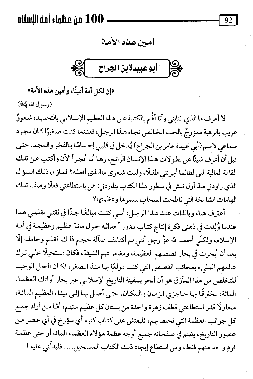 أعترف هنا، وبالذات عند هذا الرجل، أنني كنت مبالغًا جدًا في ثقتي بقلمي هذا عندما وُلدت في ذهني فكرة إنتاج كتاب تدور أحداثه حول مائة عظيم وعظيمة في أمة الإسلام، ولكنّي أحمد اللَّه عر وجل أنني لم أكتشف ضآلة حجم ذلك القلم وحامله إلّا بعد أن أبحرت في بحار قصصهم العظيمة، ومغامراتهم الشيقة، فكان مستحيلًا علي ترك عالمهم المليء بعجائب القصص التي كنت مولعًا بها منذ الصغر، فكان الحل الوحيد للتخلص من هذا المأزق هو أن أبحر بسفينة التاريخ الإسلامي عبر بحار أولئك العظماء المائة، مخترقًا بها حاجزي الزمان والمكان، حتى أصل بها إلى ميناء العظيم المائة، محاولًا قدر استطاعتي قطف زهرة واحدة من بستان كل عظيم منهم، أمّا من أراد جمع كل جوانب العظمة التي تحيط بهم، فليفتش على كتاب كتبه أي مؤرخ في أي عصر من عصور التاريخ، يضم في صفحاته جميع أوجه عظمة هؤلاء العظماء المائة أو حتى عظمة فرد واحد منهم فقط، ومن استطاع إيجاد ذلك الكتاب المستحيل. . . . فليدلَّني عليه!