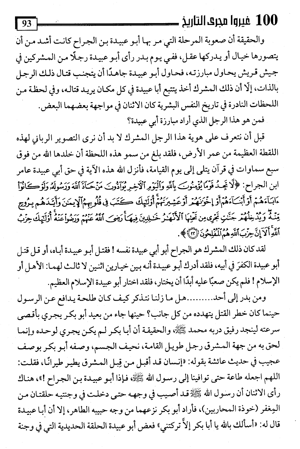 قبل أن نتعرف على هوية هذا الرجل المشرك لا بد أن نرى التصوير الرباني لهذه اللقطة العظيمة من عمر الأرض، فلقد بلغ من سمو هذه اللحظة أن خلدها اللَّه من فوق سبع سماوات في قرآن يتلى إلى يوم القيامة، فأنزل اللَّه هذه الآية في حق أبي عبيدة عامر ابن الجراح: {لَا تَجِدُ قَوْمًا يُؤْمِنُونَ بِاللَّهِ وَالْيَوْمِ الْآخِرِ يُوَادُّونَ مَنْ حَادَّ اللَّهَ وَرَسُولَهُ وَلَوْ كَانُوا آبَاءَهُمْ أَوْ أَبْنَاءَهُمْ أَوْ إِخْوَانَهُمْ أَوْ عَشِيرَتَهُمْ أُولَئِكَ كَتَبَ فِي قُلُوبِهِمُ الْإِيمَانَ وَأَيَّدَهُمْ بِرُوحٍ مِنْهُ وَيُدْخِلُهُمْ جَنَّاتٍ تَجْرِي مِنْ تَحْتِهَا الْأَنْهَارُ خَالِدِينَ فِيهَا رَضِيَ اللَّهُ عَنْهُمْ وَرَضُوا عَنْهُ أُولَئِكَ حِزْبُ اللَّهِ أَلَا إِنَّ حِزْبَ اللَّهِ هُمُ الْمُفْلِحُونَ (22)}.