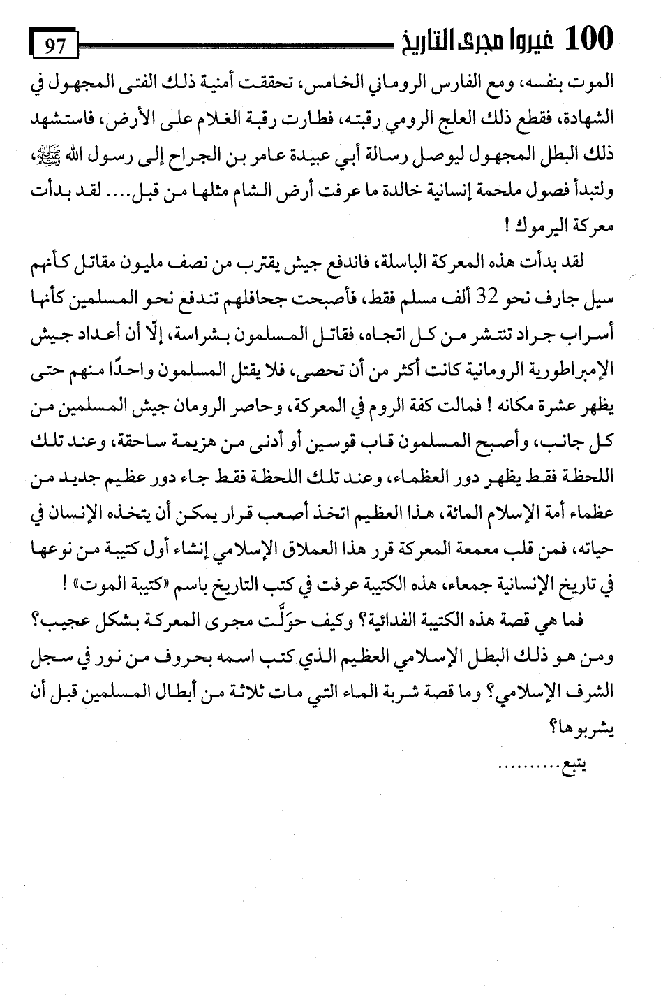 فما هي قصة هذه الكتيبة الفدائية؟ وكيف حوَلَّت مجرى المعركة بشكل عجيب؟ ومن هو ذلك البطل الإسلامي العظيم الذي كتب اسمه بحروف من نور في سجل الشرف الإسلامي؟ وما قصة شربة الماء التي مات ثلاثة من أبطال المسلمين قبل أن يشربوها؟