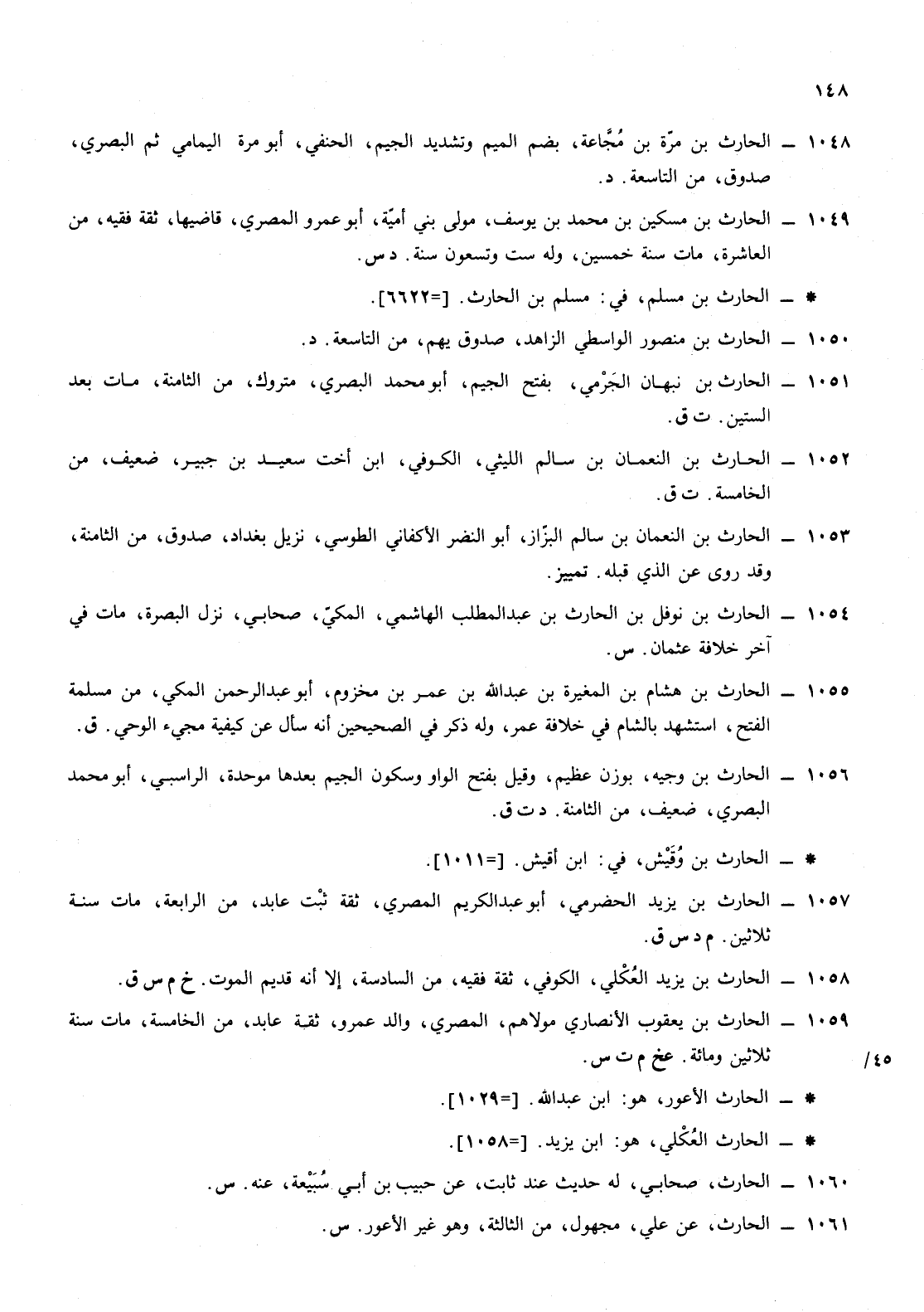 1057- الحارث ابن يزيد الحضرمي أبو عبد الكريم المصري ثقة ثبت عابد من الرابعة مات سنة ثلاثين م د س ق