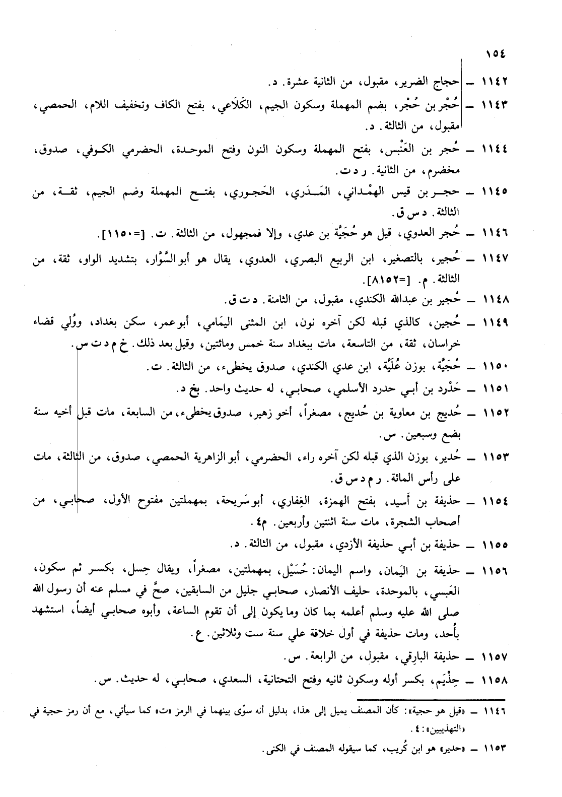 1144- حجر ابن العنبس بفتح المهملة وسكون النون وفتح الموحدة الحضرمي الكوفي صدوق مخضرم من الثانية ر د ت