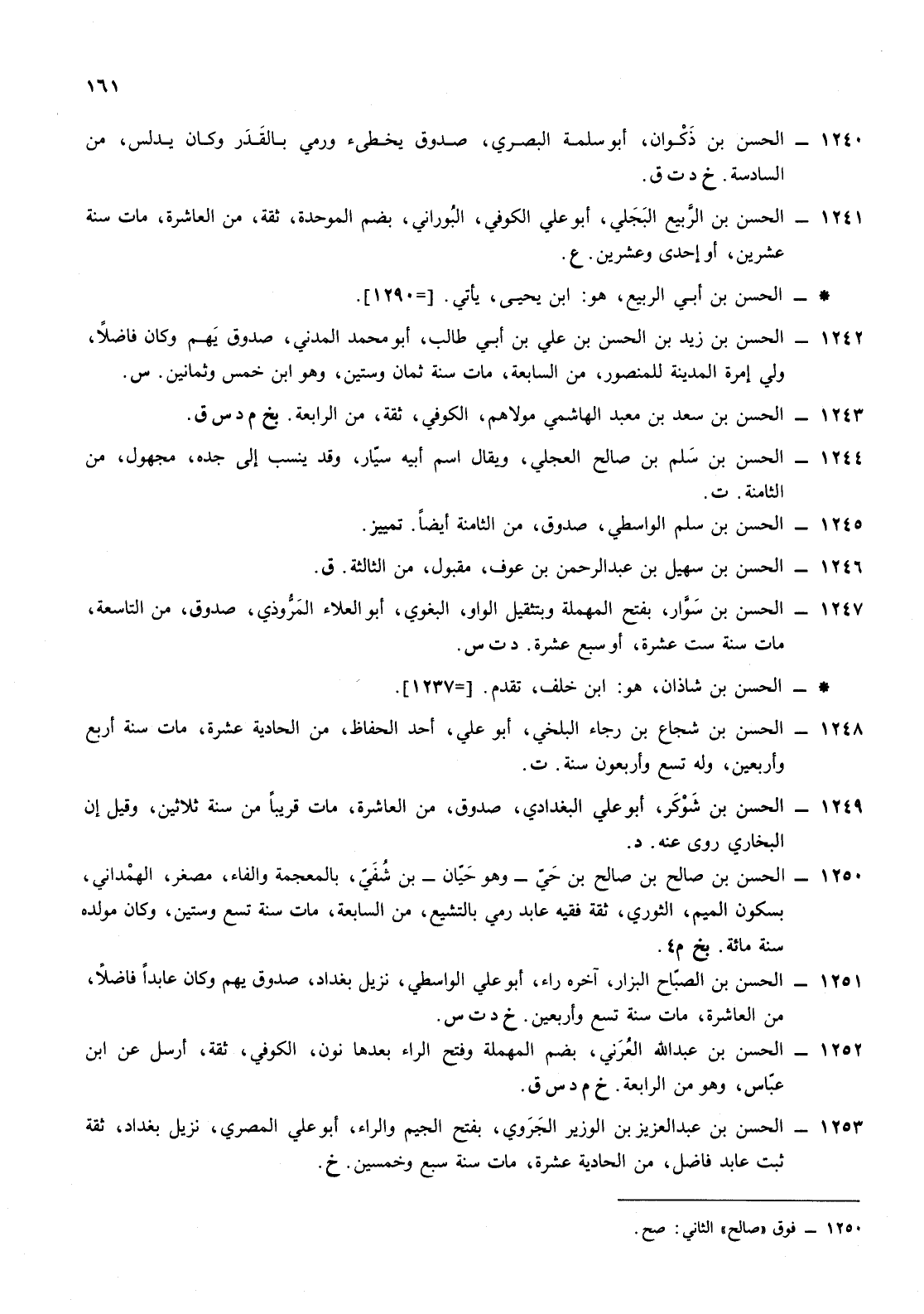 1251- الحسن ابن الصباح البزار آخره راء أبو علي الواسطي نزيل بغداد صدوق يهم وكان عابدا فاضلا من العاشرة مات سنة تسع وأربعين خ ت س