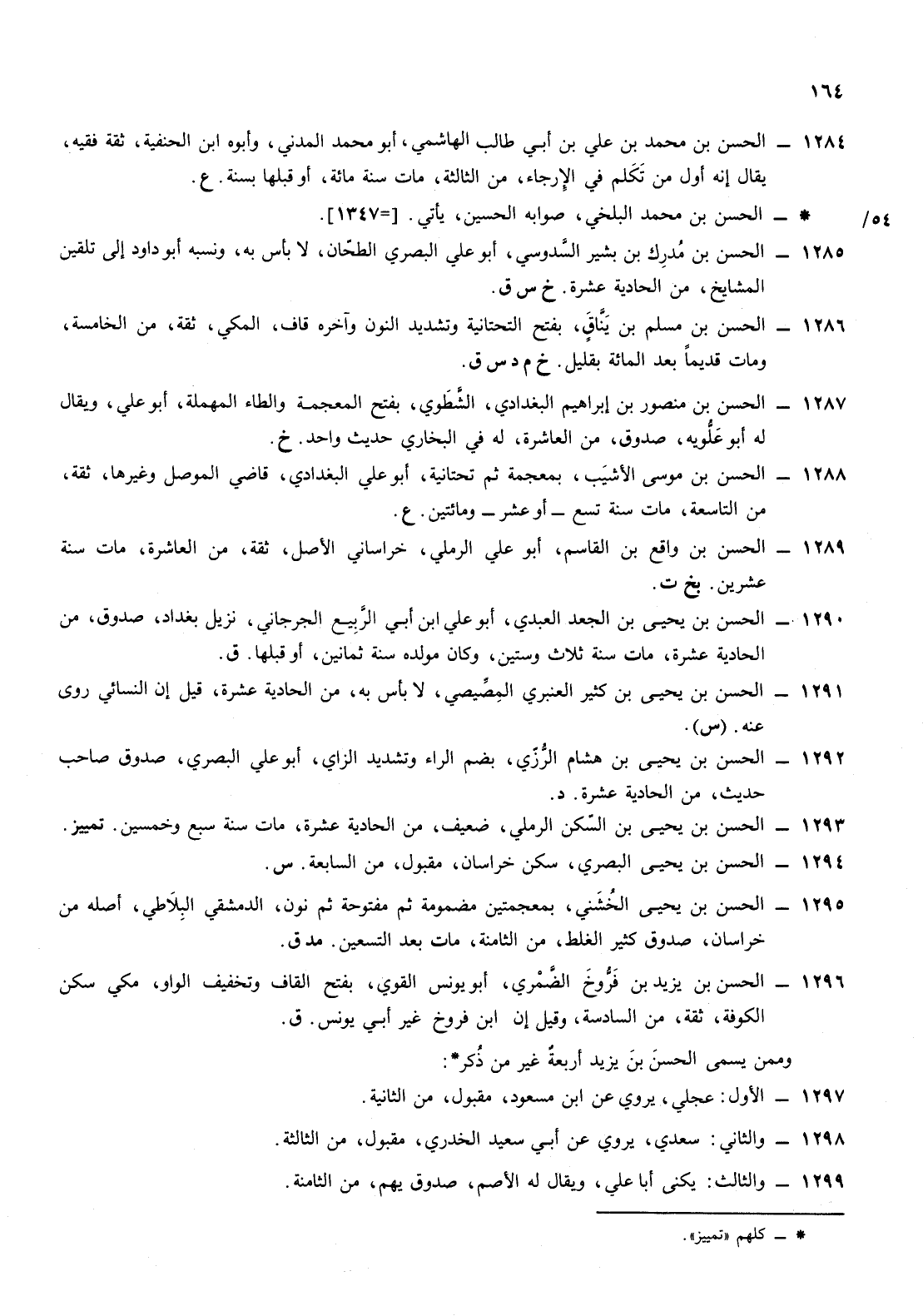 1284- الحسن ابن محمد ابن علي ابن أبي طالب الهاشمي أبو محمد المدني وأبوه ابن الحنفية ثقة فقيه يقال إنه أول من تكلم في الارجاء من الثالثة مات سنة مائة أو قبلها بسنة ع
