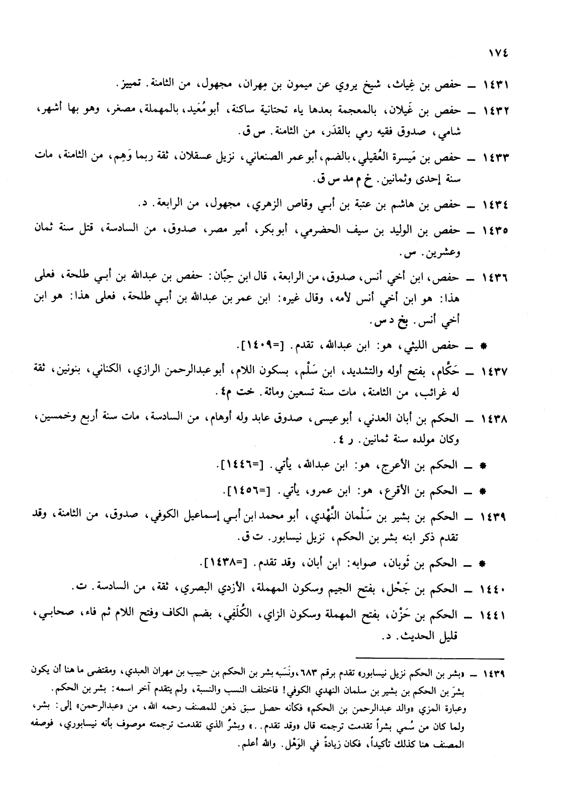 1439- الحكم ابن بشير ابن سلمان النهدي أبو محمد ابن أبي إسماعيل الكوفي صدوق من الثامنة وقد تقدم ذكر ابنه [أبيه بشير بن سليمان] بشر ابن الحكم نزيل نيسابور ت ق