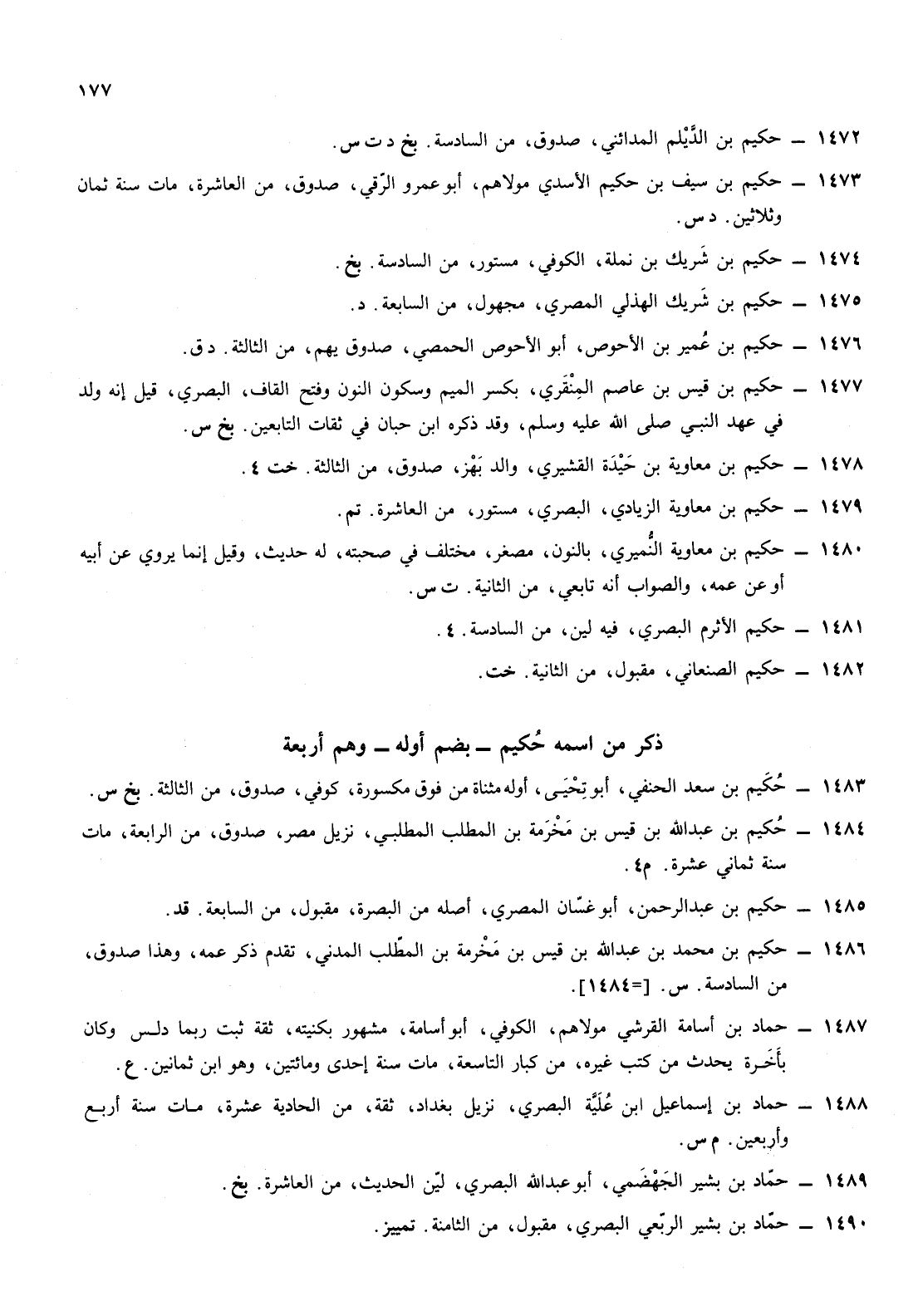 1477- حكيم ابن قيس ابن عاصم المنقري بكسر الميم وسكون النون وفتح القاف البصري قيل إنه ولد في عهد النبي صَلَّى اللهُ عَلَيْهِ وَسَلَّمَ وقد ذكره ابن حبان في ثقات التابعين بخ س