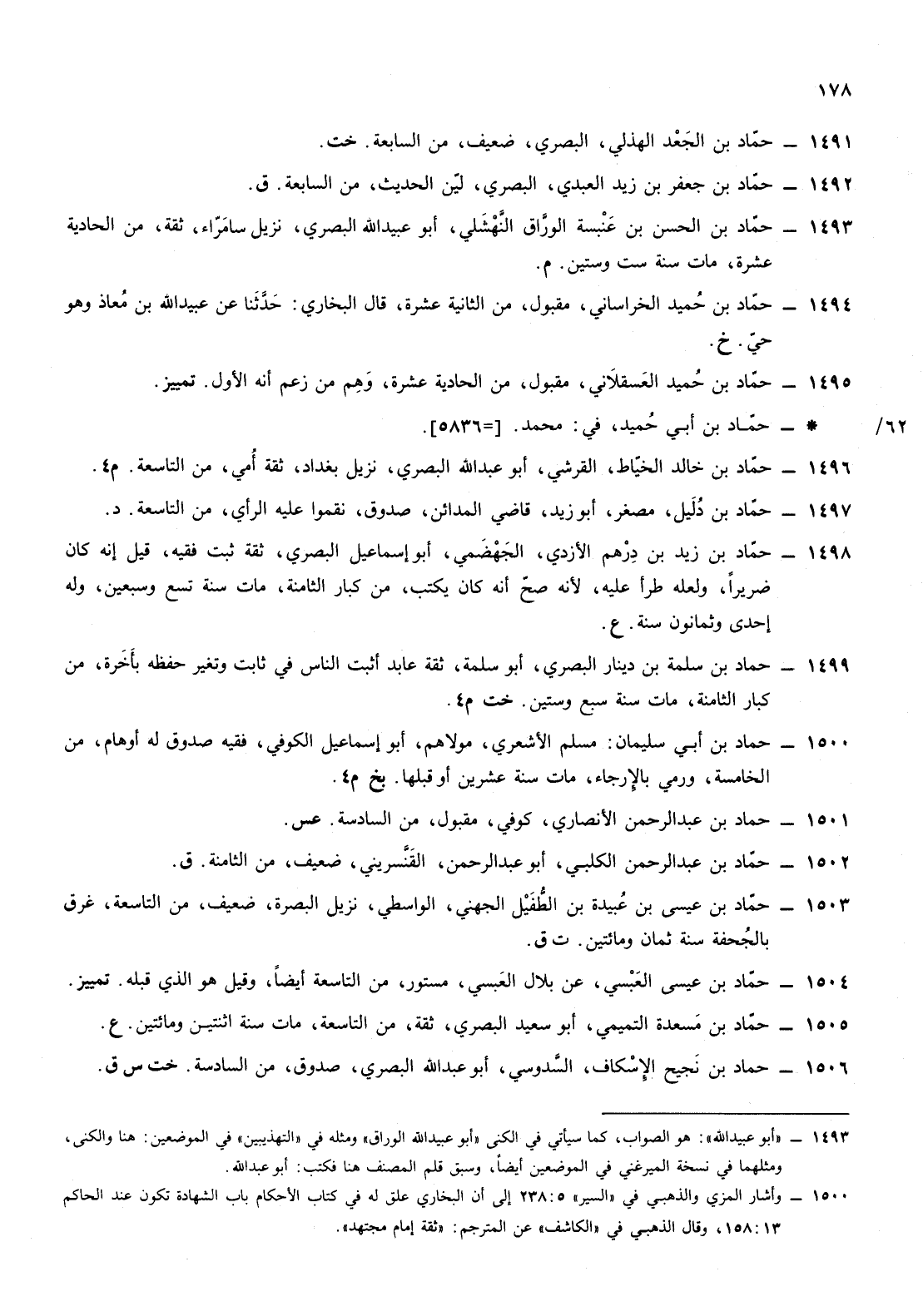 1498- حماد ابن زيد ابن درهم الأزدي الجهضمي أبو إسماعيل البصري ثقة ثبت فقيه قيل إنه كان ضريرا ولعله طرأ عليه لأنه صح أنه كان يكتب من كبار الثامنة مات سنة تسع وسبعين وله إحدى وثمانون سنة ع
