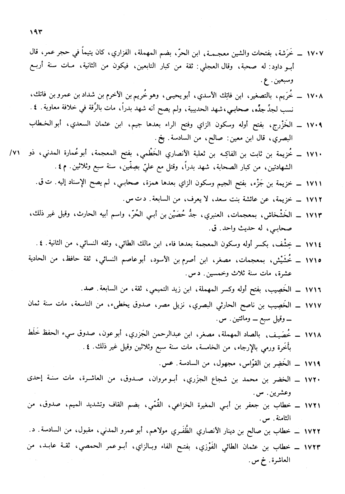 1715- خشيش بمعجمات مصغر ابن أصرم ابن الأسود أبو عاصم النسائي ثقة حافظ من الحادية عشرة مات سنة ثلاث وخمسين د س