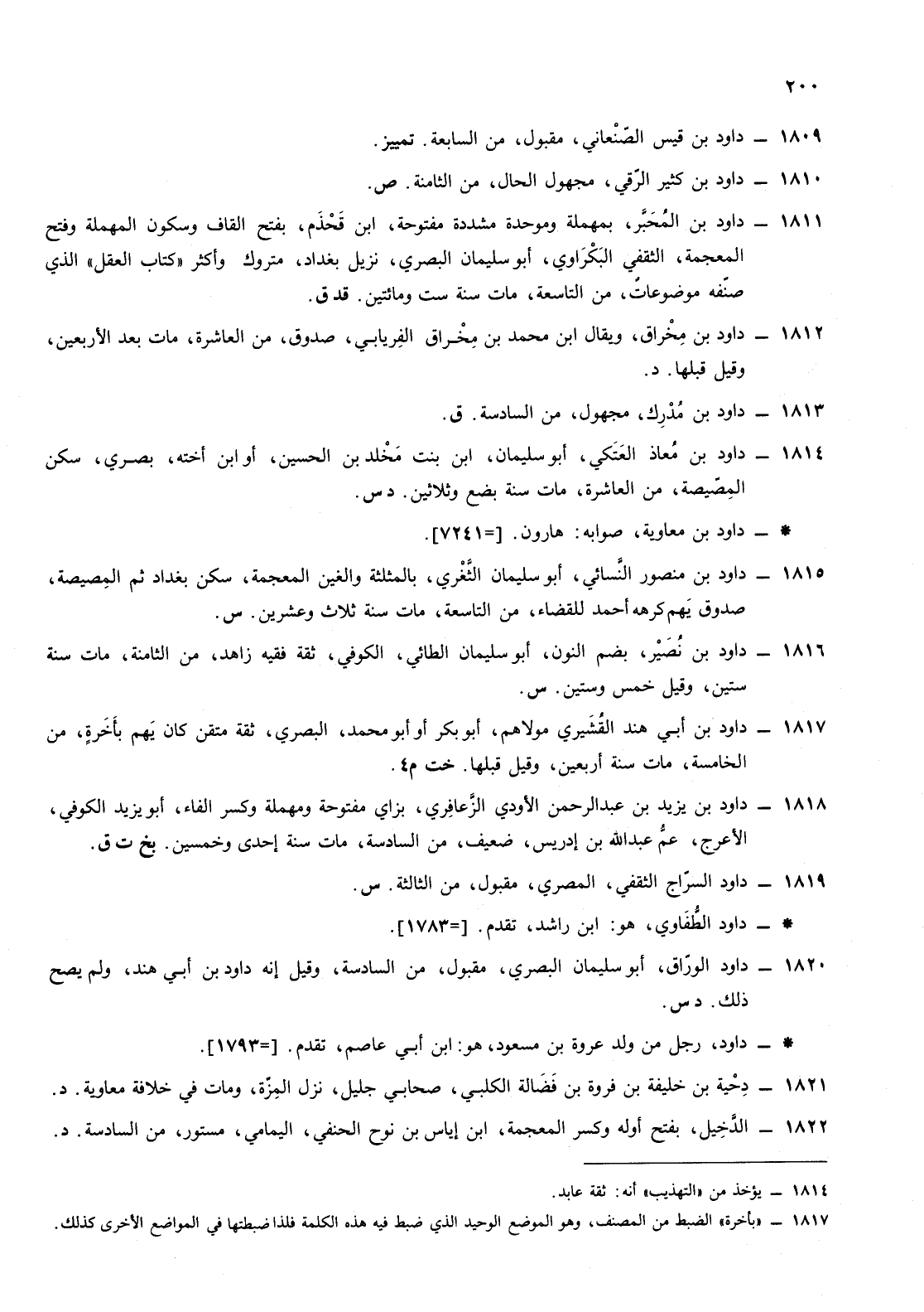 1816- داود ابن نصير بضم النون أبو سليمان الطائي الكوفي ثقة فقيه زاهد من الثامنة مات سنة ستين وقيل خمس وستين س