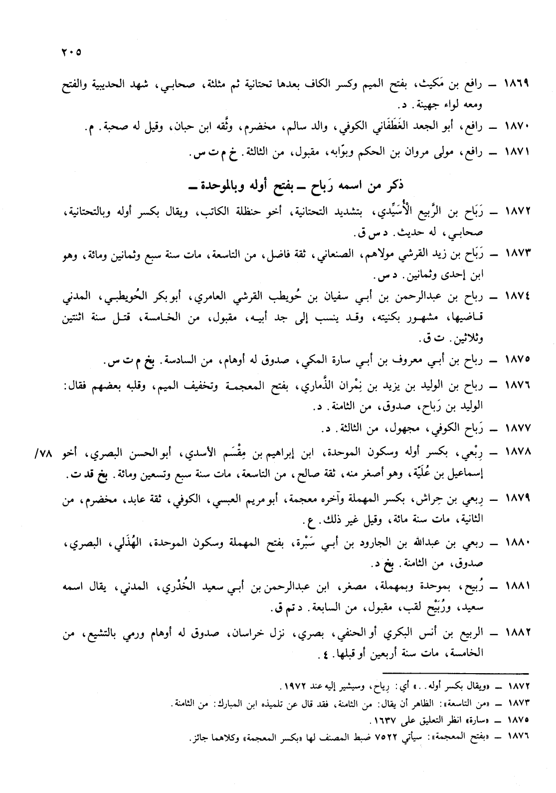 1872- رباح ابن الربيع الأسيدي بتشديد التحتانية أخو حنظلة الكاتب ويقال بكسر أوله وبالتحتانية صحابي له حديث د س ق