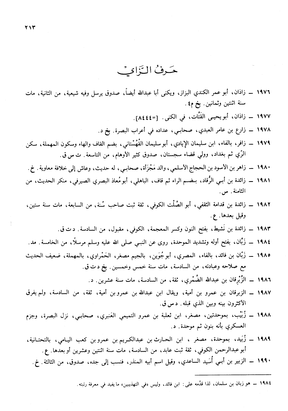 1989- زبيد بموحدة مصغر ابن الحارث ابن عبد الكريم ابن عمرو ابن كعب اليامي بالتحتانية أبو عبد الرحمن الكوفي ثقة ثبت عابد من السادسة مات سنة اثنتين وعشرين أو بعدها ع
