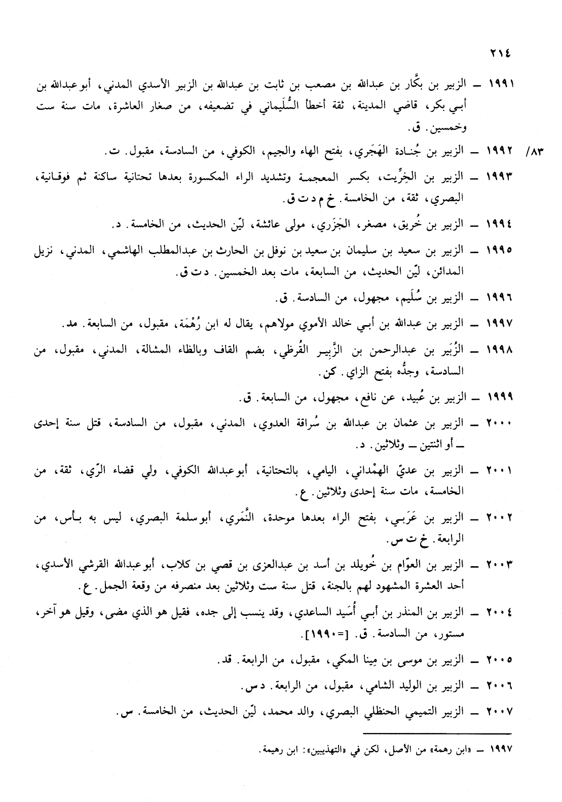 1998- الزبير ابن عبد الرحمن ابن الزبير القرظي بضم القاف وبالظاء المشالة المدني مقبول من السادسة وجده بفتح الزاي كن