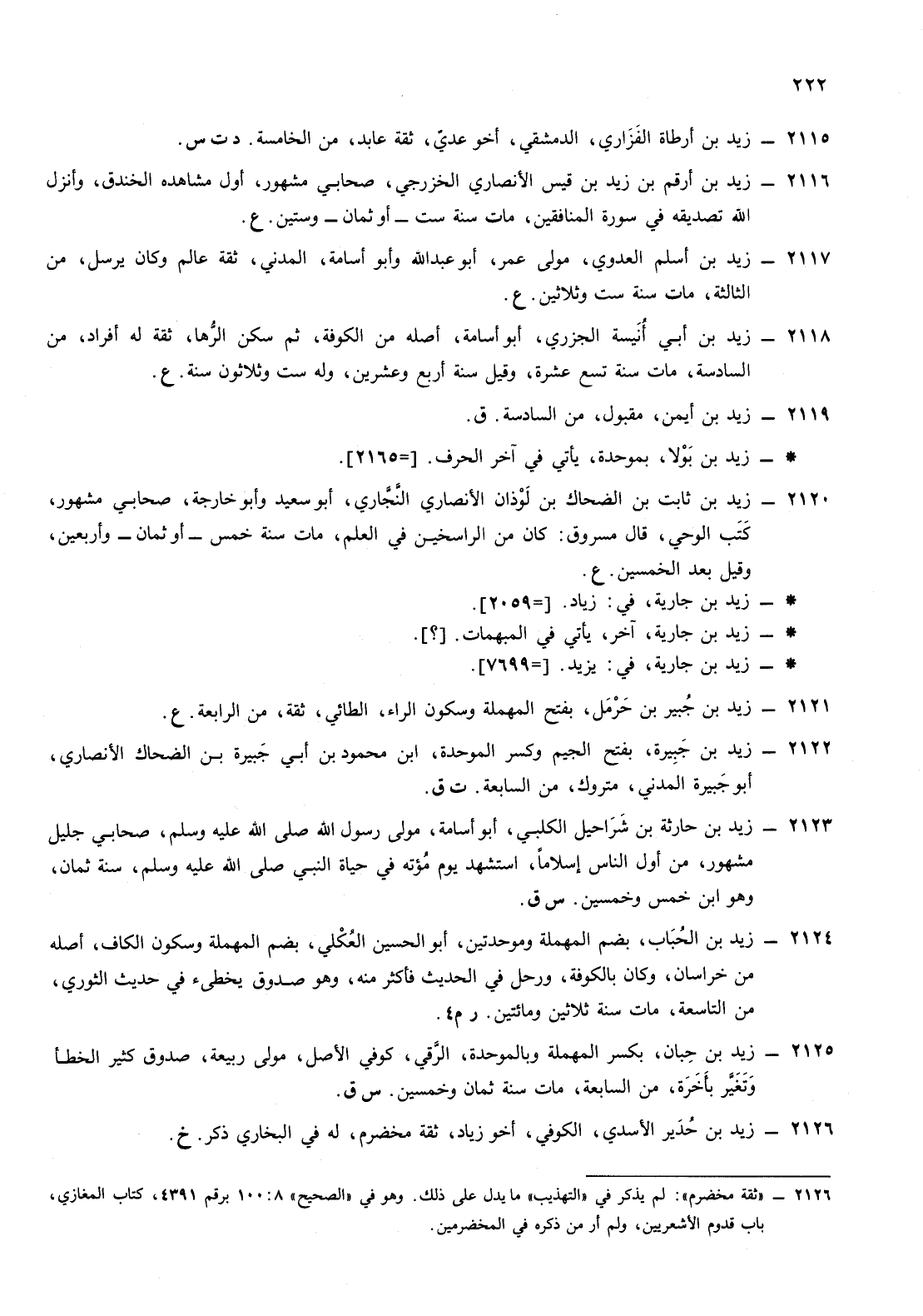 2117- زيد ابن أسلم العدوي مولى عمر أبو عبد الله وأبو أسامة المدني ثقة عالم وكان يرسل من الثالثة مات سنة ست وثلاثين ع
