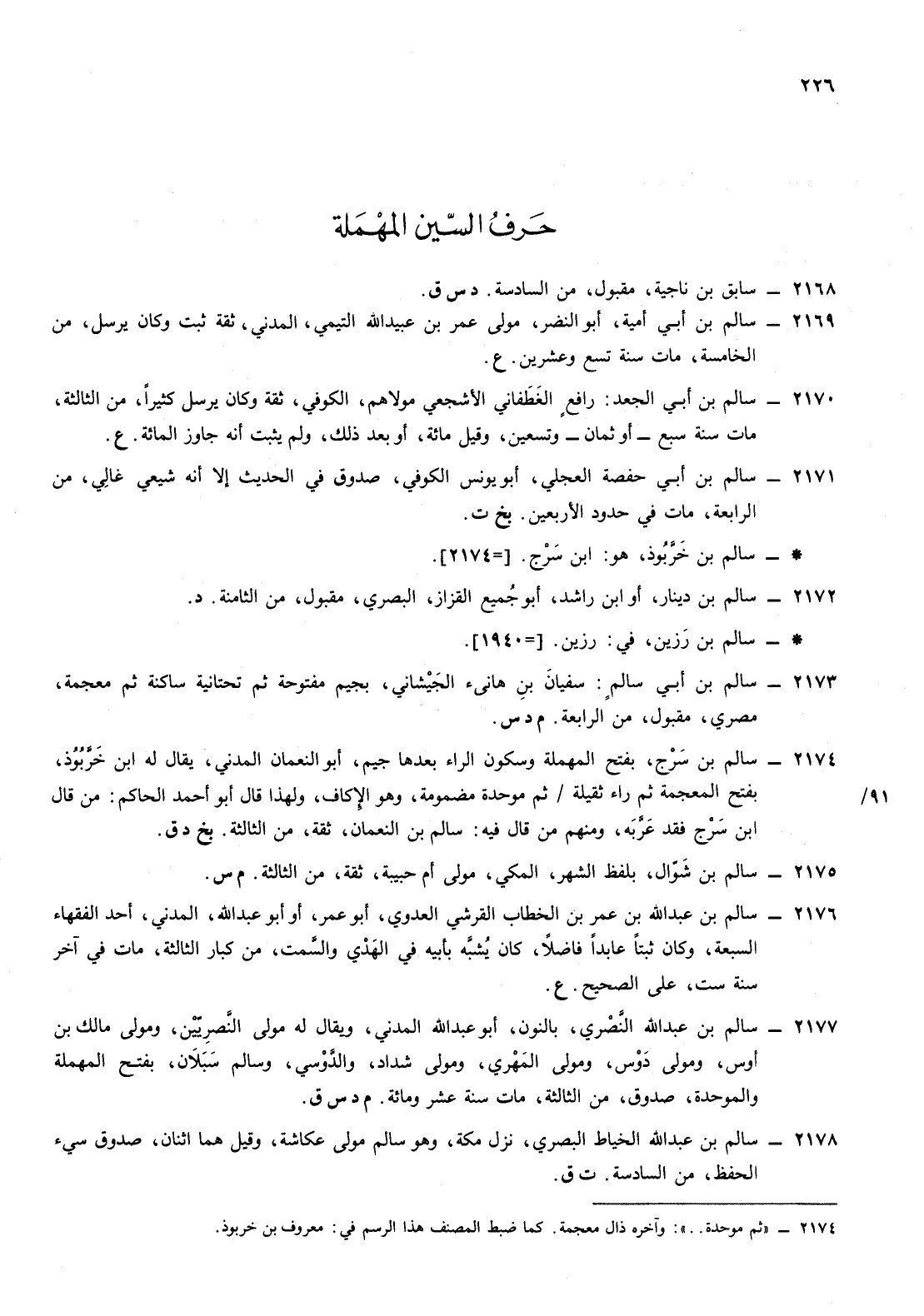 2176- سالم ابن عبد الله ابن عمر ابن الخطاب القرشي العدوي أبو عمر أو أبو عبد الله المدني أحد الفقهاء السبعة وكان ثبتا عابدا فاضلا كان يشبه بأبيه في الهدي والسمت من كبار الثالثة مات في آخر سنة ست على الصحيح ع
