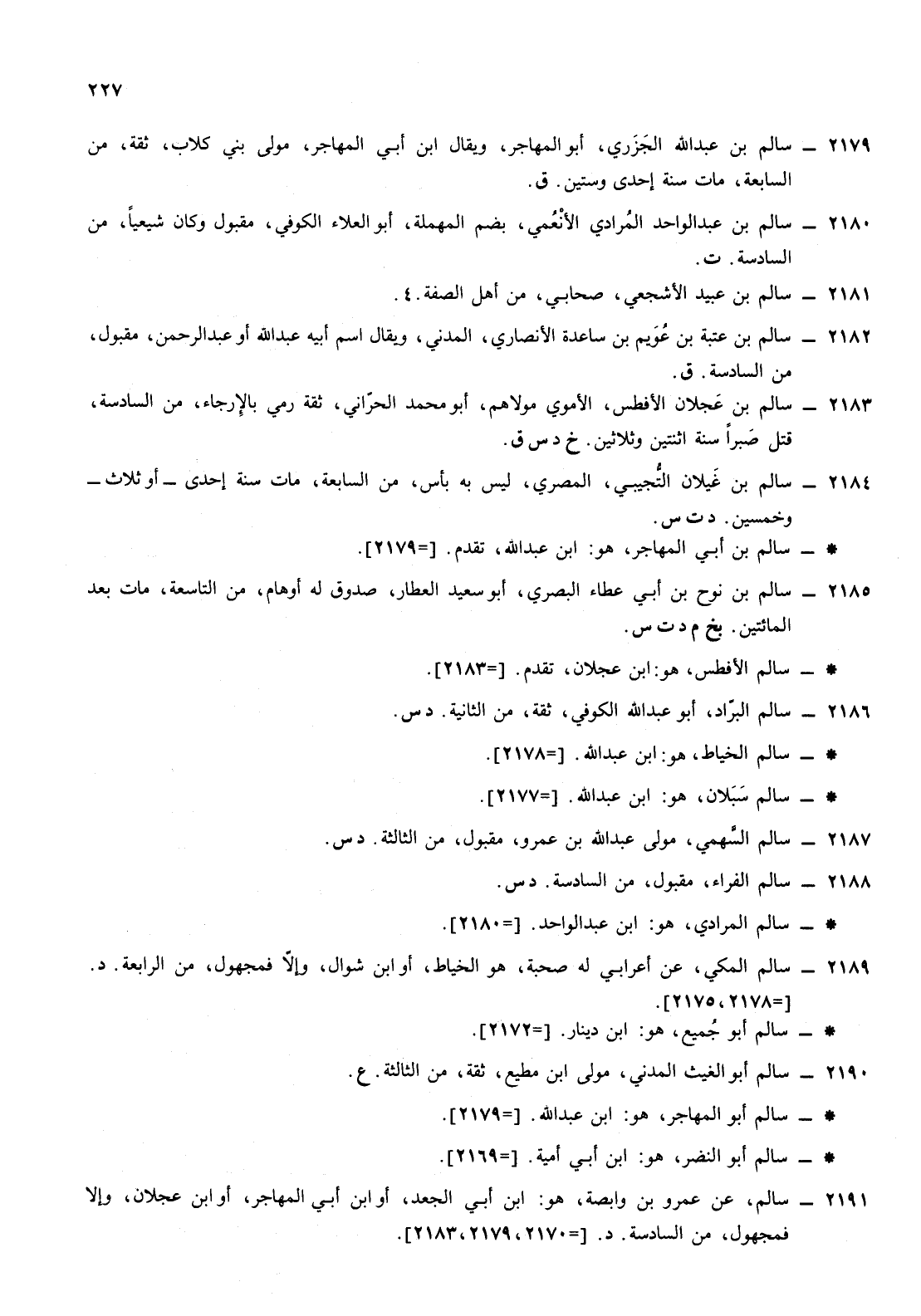 2179- سالم ابن عبد الله الجزري أبو المهاجر ويقال ابن أبي المهاجر مولى بني كلاب ثقة من السابعة مات سنة إحدى وستين ق