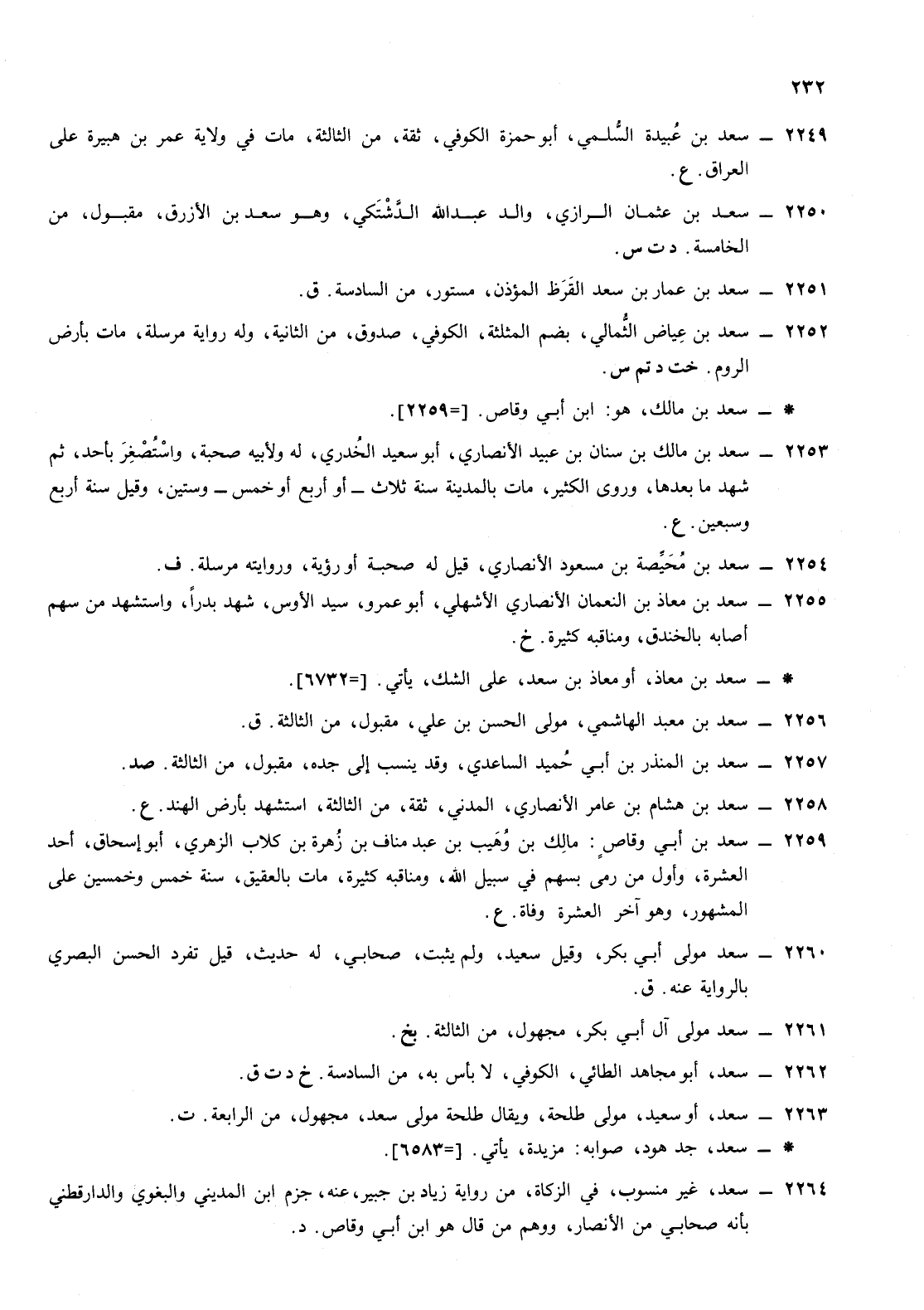 2249- سعد ابن عبيدة السلمي أبو حمزة الكوفي ثقة من الثالثة مات في ولاية عمر ابن هبيرة على العراق ع