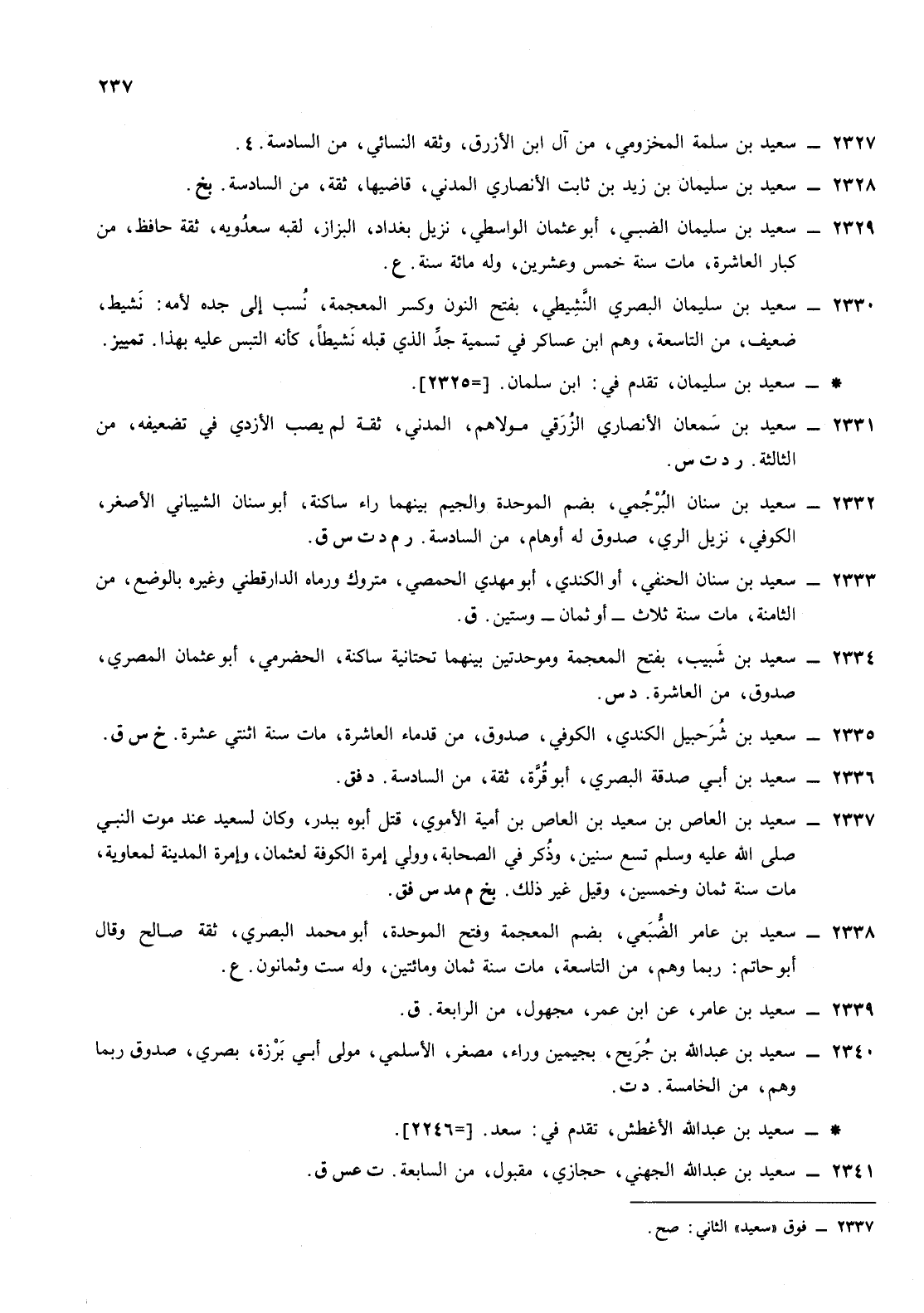 2335- سعيد ابن شرحبيل الكندي الكوفي صدوق من قدماء العاشرة مات سنة اثنتي عشرة خ س ق
