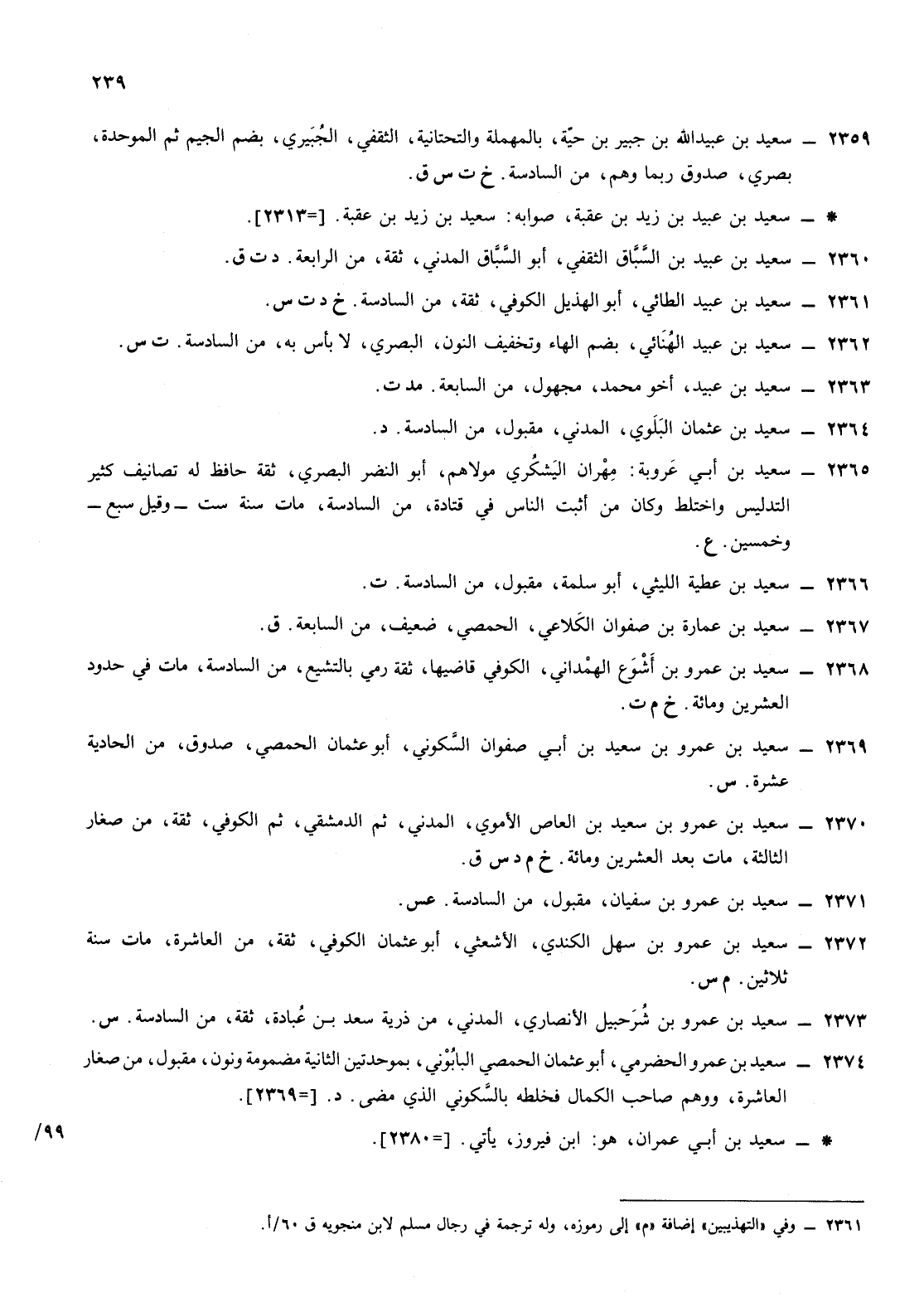 2359- سعيد ابن عبيد الله ابن جبير ابن حية بالمهملة والتحتانية الثقفي الجبيري بضم الجيم ثم الموحدة بصري صدوق ربما وهم من السادسة خ ت س ق