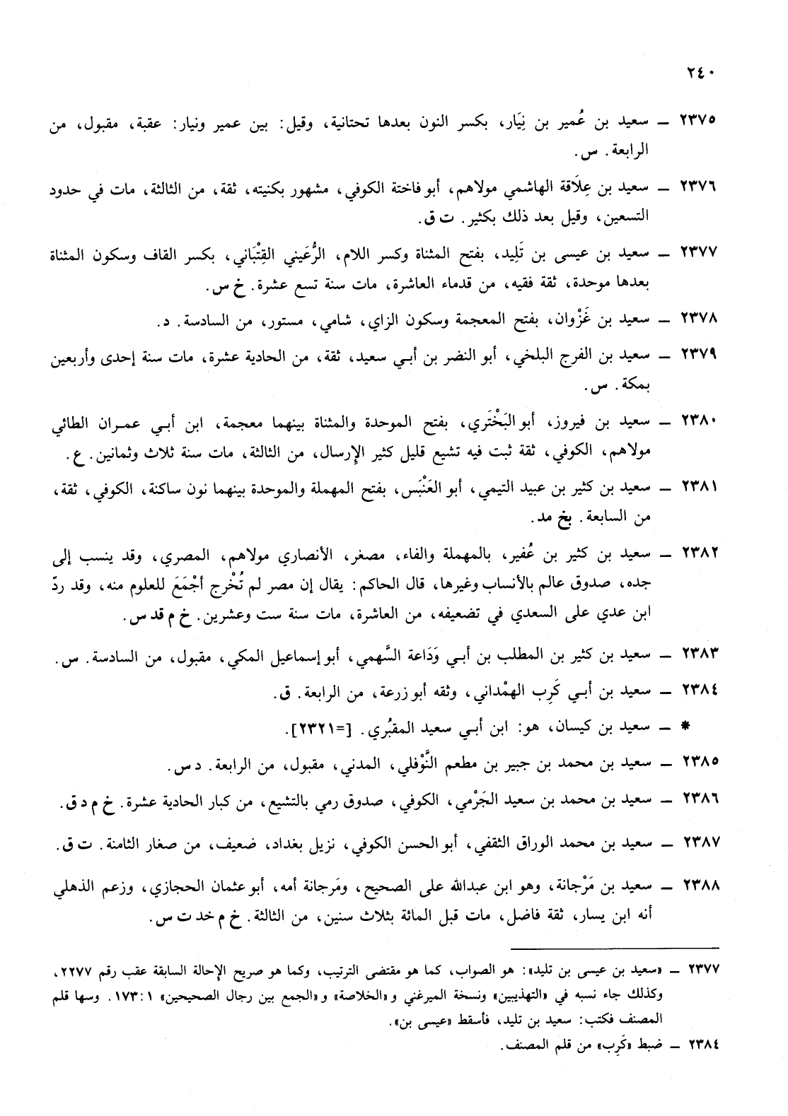2377- سعيد ابن عيسى [بن سعيد] ابن تليد بفتح المثناة وكسر اللام الرعيني [وقد ينسب إلى جده] القتباني بكسر القاف وسكون المثناة بعدها موحدة ثقة فقيه من قدماء العاشرة مات سنة تسع عشرة خ س