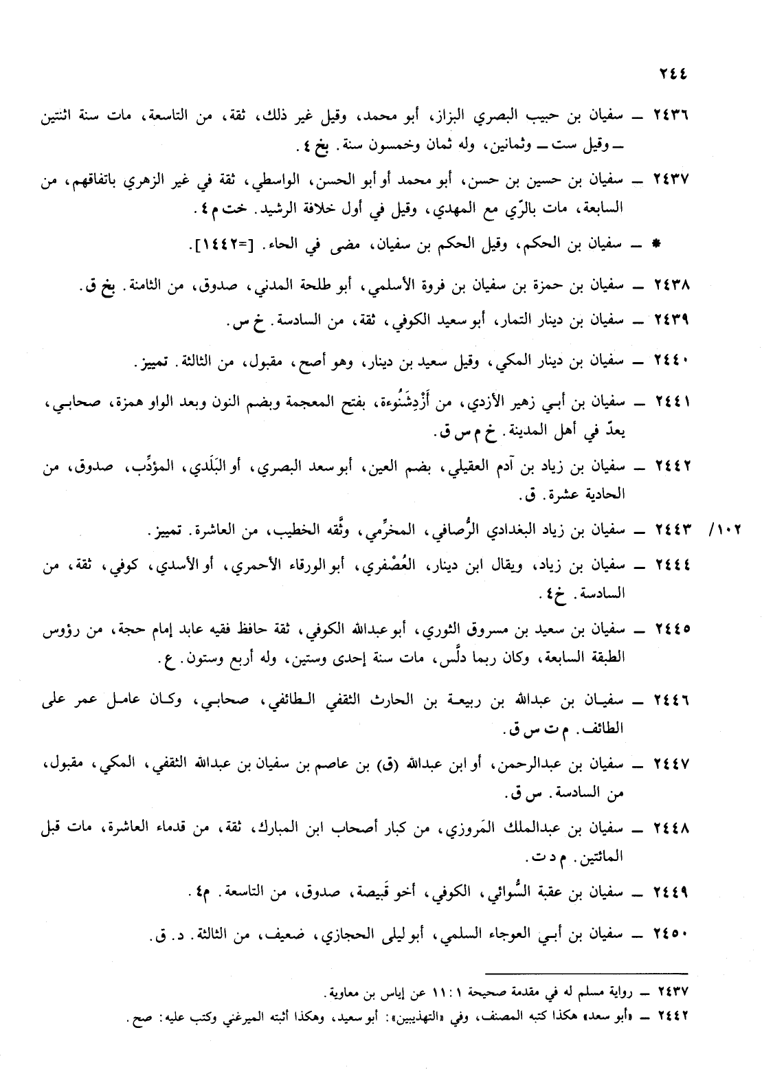 2445- سفيان ابن سعيد ابن مسروق الثوري أبو عبد الله الكوفي ثقة حافظ فقيه عابد إمام حجة من رؤوس الطبقة السابعة وكان ربما دلس مات سنة إحدى وستين وله أربع وستون ع