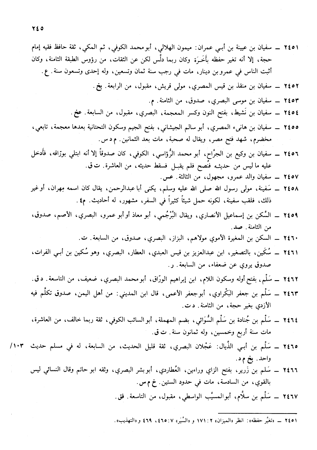 2451- سفيان ابن عيينة ابن أبي عمران ميمون الهلالي أبو محمد الكوفي ثم المكي ثقة حافظ فقيه إمام حجة إلا أنه تغير حفظه بأخرة وكان ربما دلس لكن عن الثقات من رؤوس الطبقة الثامنة وكان أثبت الناس في عمرو ابن دينار مات في رجب سنة ثمان وتسعين وله إحدى وتسعون سنة ع