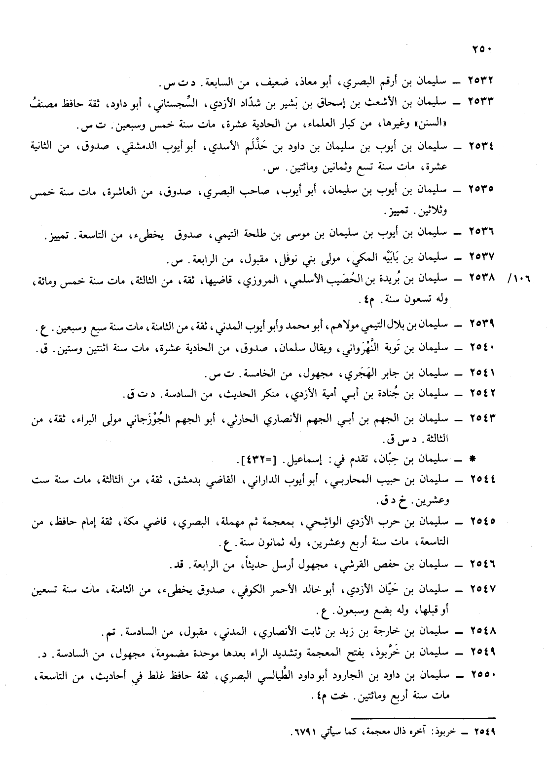 2533- سليمان ابن الأشعث ابن إسحاق ابن بشير ابن شداد الأزدي السجستاني أبو داود ثقة حافظ مصنف السنن وغيرها من كبار العلماء من الحادية عشرة مات سنة خمس وسبعين ت س