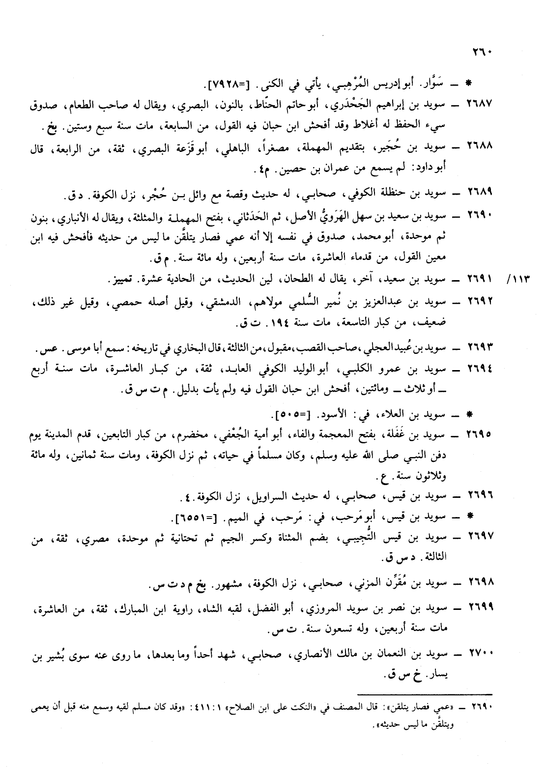 2695- سويد ابن غفلة بفتح المعجمة والفاء أبو أمية الجعفي مخضرم [من الثانية] من كبار التابعين قدم المدينة يوم دفن النبي صَلَّى اللهُ عَلَيْهِ وَسَلَّمَ وكان مسلما في حياته ثم نزل الكوفة ومات سنة ثمانين وله مائة وثلاثون سنة ع