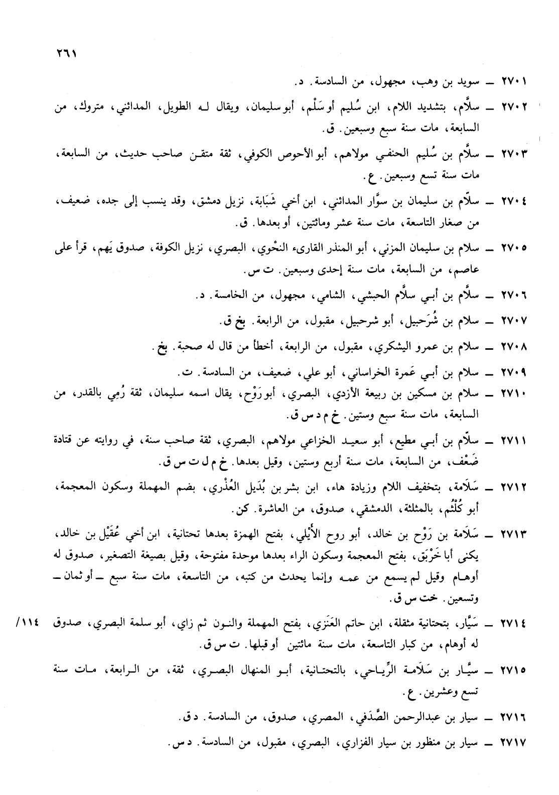 2710- سلام ابن مسكين ابن ربيعة الأزدي البصري أبو روح يقال اسمه سليمان ثقة رمي بالقدر من السابعة مات سنة سبع وستين خ م د س ق