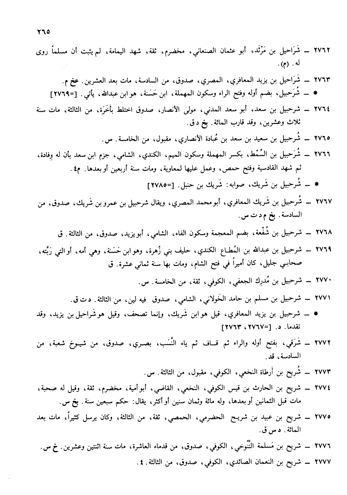 2775- شريح ابن عبيد ابن شريح الحضرمي الحمصي ثقة من الثالثة وكان يرسل كثيرا مات بعد المائة د س ق