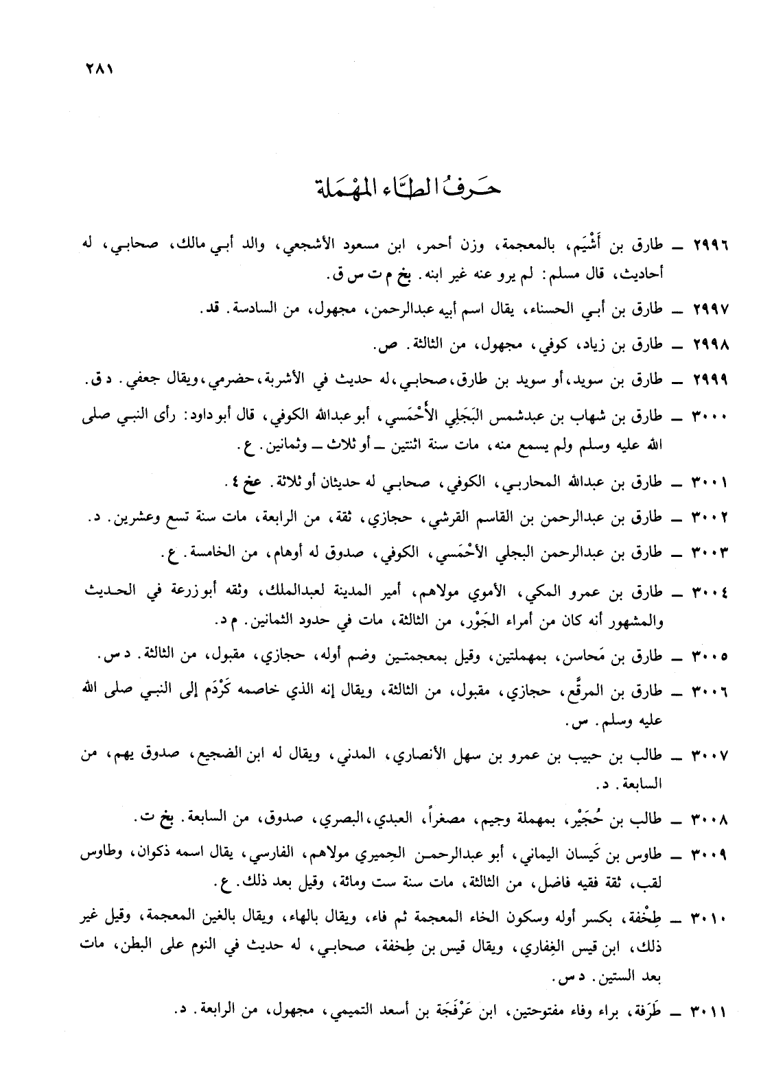 3000- طارق ابن شهاب ابن عبد شمس البجلي الأحمسي أبو عبد الله الكوفي قال أبو داود رأى النبي صَلَّى اللهُ عَلَيْهِ وَسَلَّمَ ولم يسمع منه مات سنة اثنتين أو ثلاث وثمانين ع