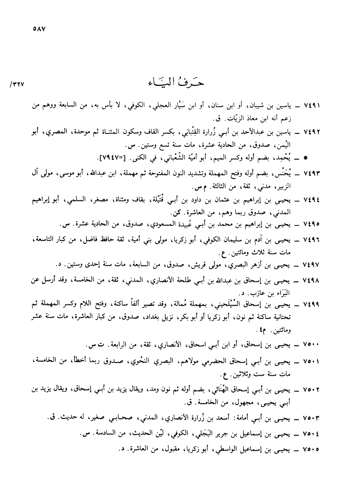 7501- يحيى ابن أبي إسحاق الحضرمي مولاهم البصري النحوي صدوق ربما أخطأ من الخامسة مات سنة ست وثلاثين ع